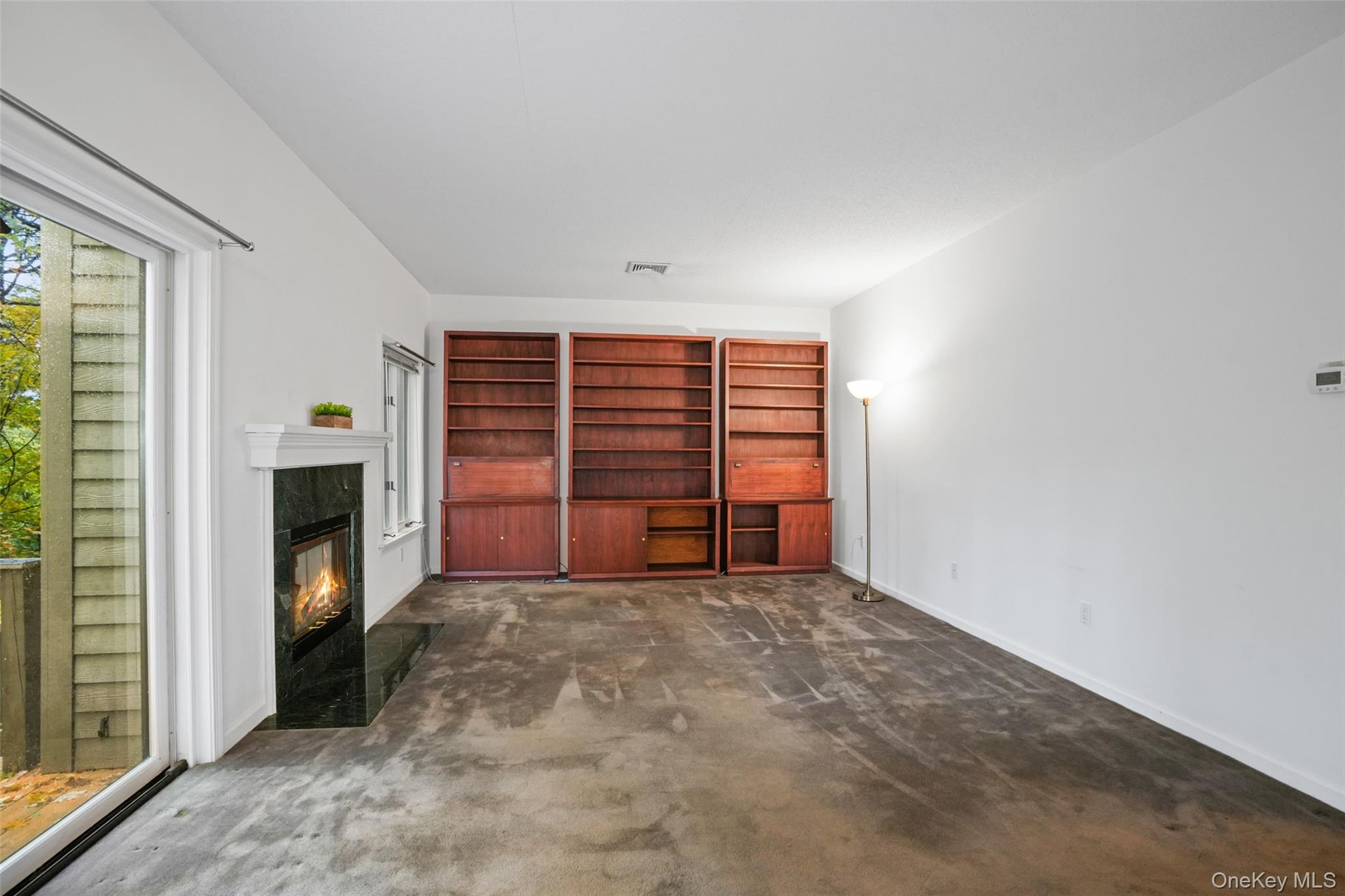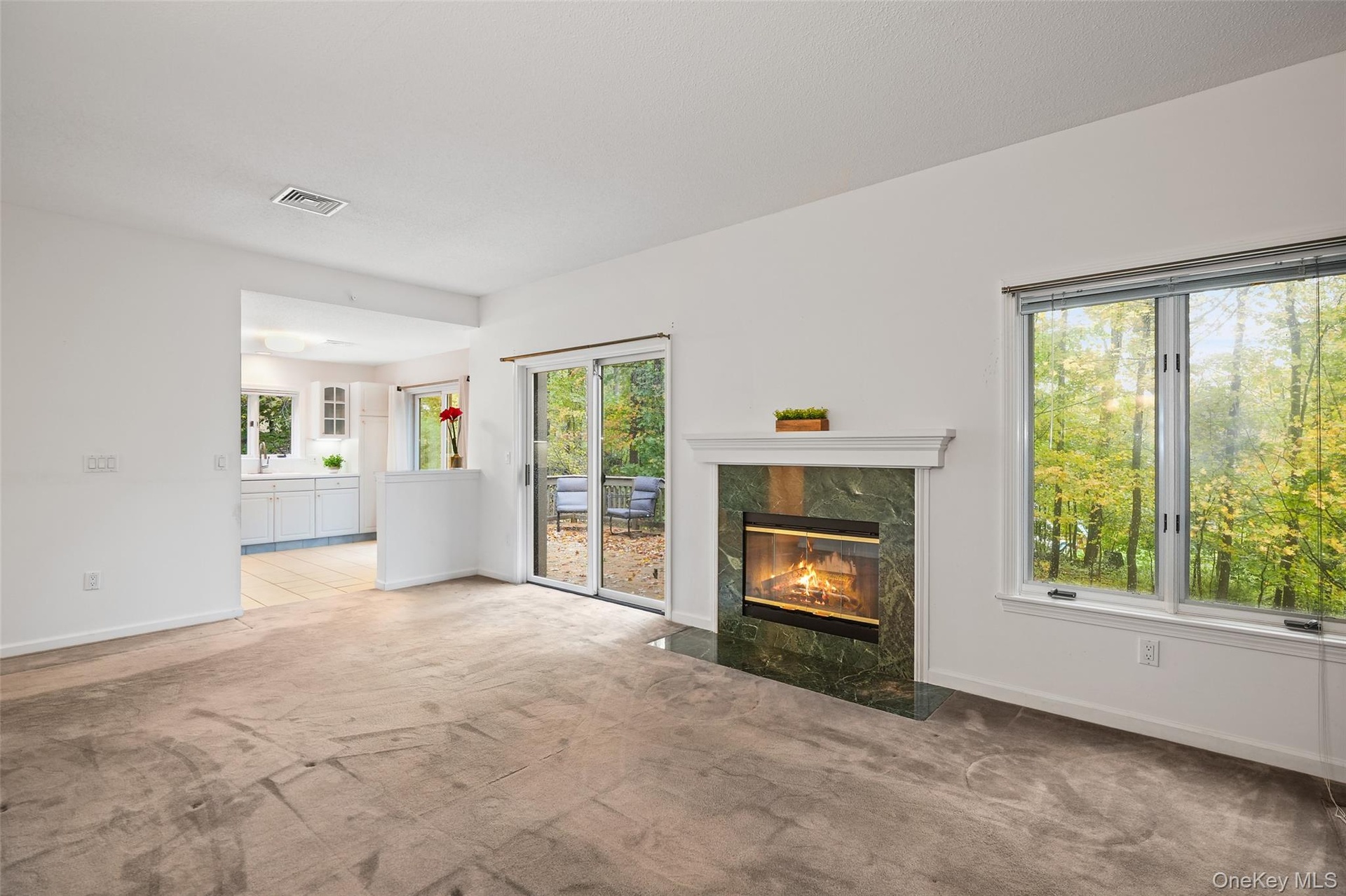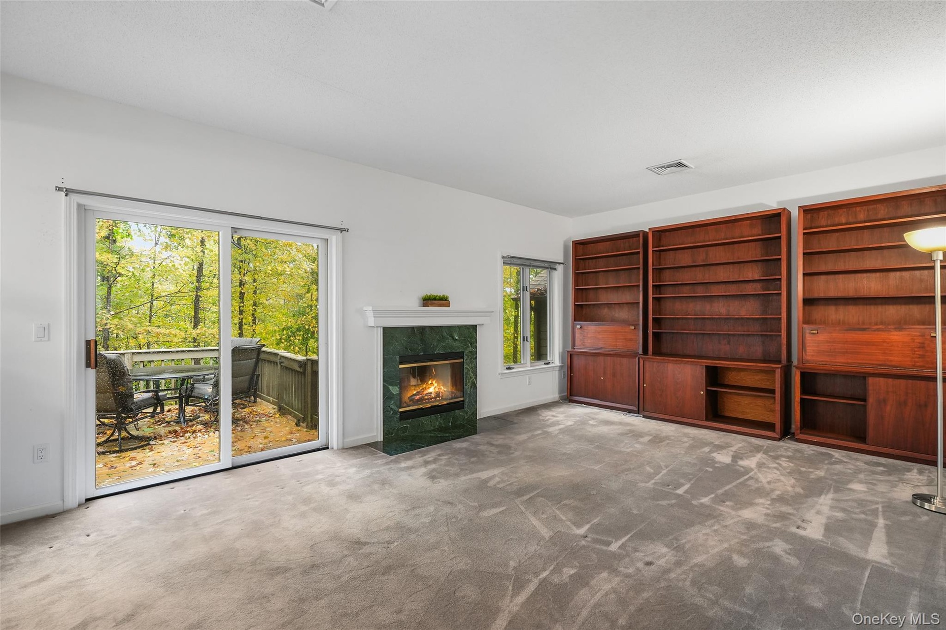 Desirable one-bedroom, two-bath, one-level Amherst end unit with a den that can easily function as a second bedroom or home office, complete with pocket doors for privacy. This condo lives like a two-bedroom and features gas heat, and an attached one-car garage. The formal living room offers a brick wood-burning fireplace, perfect for cozy evenings, while the eat-in kitchen includes white cabinetry, white appliances, and a slider leading out to a private deck overlooking the woods—a peaceful, scenic setting ideal for relaxation. The primary bedroom features an ensuite bath and a walk-in closet. Additional highlights include stackable washer/dryer in the hall bath, a new water heater (2024), HVAC (2014), roof (2021). With four visitor parking spots directly adjacent to the unit, and a quiet location, this condo is a wonderful opportunity in Heritage Hills. Condo is being sold as is. Enjoy the Heritage Hills lifestyle: 5 pools, tennis, pickleball, Activity Center, Fitness Center, 24-hour security with EMS, free shuttle to train and shops, and much, much more. Buyers are required to pay a one-time fee of $1500 to Society at closing. HOA of $584.52 includes (Condo 29 fee $448.41) + (Society fee $136.11). Sewer fee is $48.61 monthly; water is approximately $40 per month, based on usage. Taxes are without Basic STAR exemption of $1447.22. No assessments.