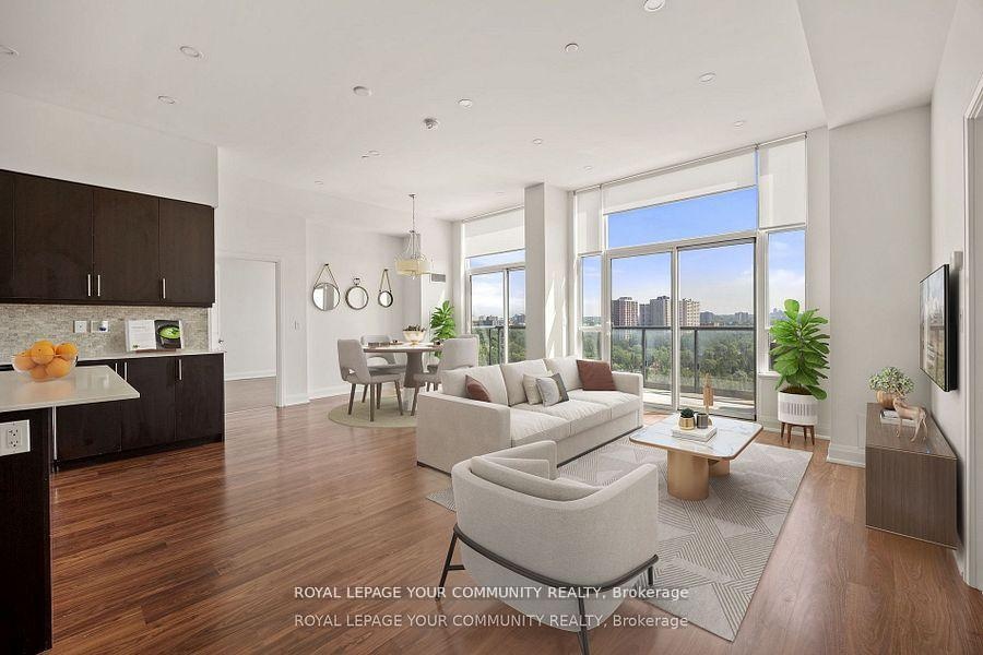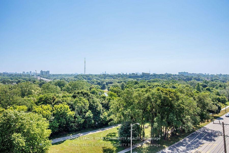 Welcome to Perspective Condominiums in the heart of Etobicoke. This 2 bedroom + Den Penthouse suite features 10ft ceilings with upgraded pot lights throughout. Open concept living, kitchen, and dining room gives you all the space to decorate to your hearts desire. Large balcony with gas line for BBQ hookup over looking the Humber River and CN Tower. Primary bedroom includes a walk-in closet and ensuite bath. Rarely available 2 side by side Parking Spots adjacent to the elevator and 1 spacious storage locker. The building offers 24 hour security/concierge, an all year round indoor pool with steam rooms, 2 Party Rooms, Theater Room, Golf Simulator, Exercise Room, Pet Spa and 6th floor roof top terrace with BBQs. Guest suites are available year round for visiting family and friends. This location can't be beat. Walk to nearby James Gardens or Enjoy a bike/walk through the lush Humber River Trails. Easy access to the upcoming Eglington LRT, TTC, HWY 427, HWY 400, and a short commute to downtown Toronto, Bloor West Village, and the Junction. Shops at ground level include a cafe, pharmacy, dental office, and optometrist for your convenience.
