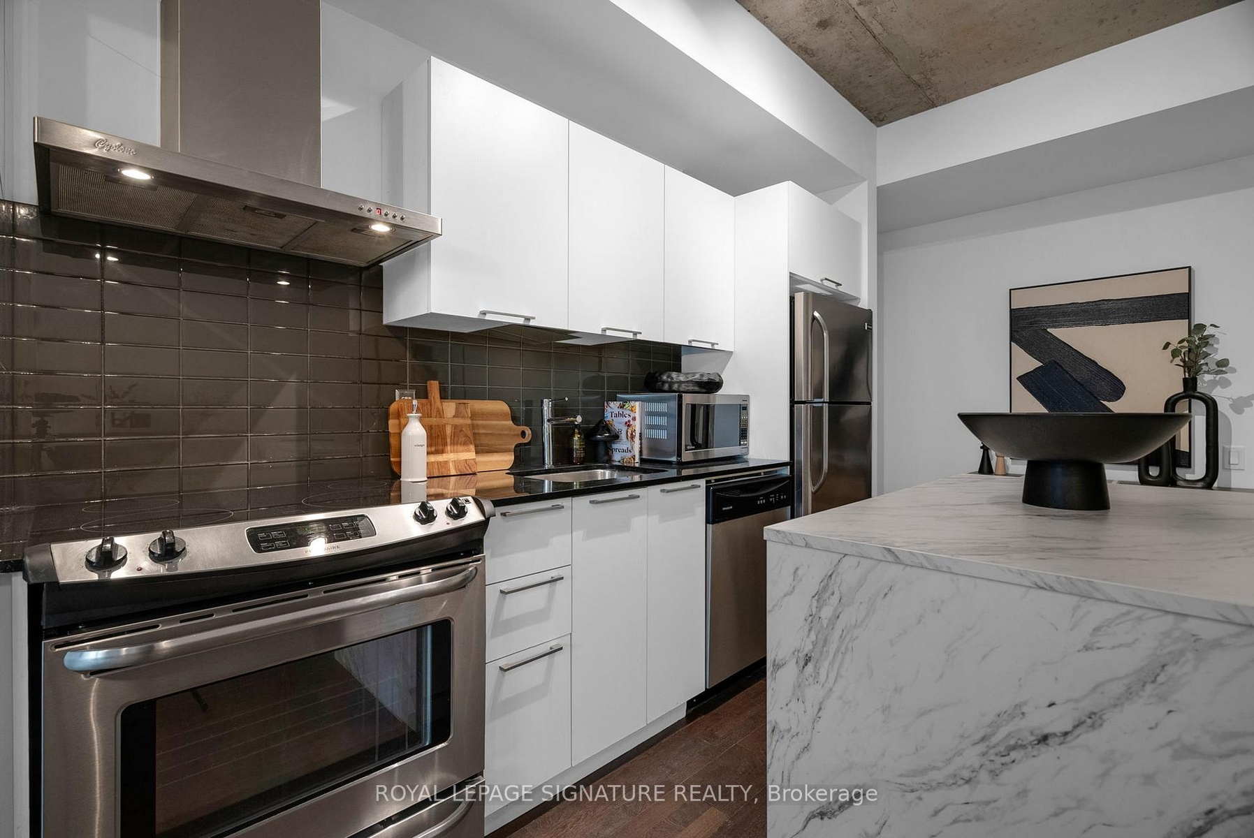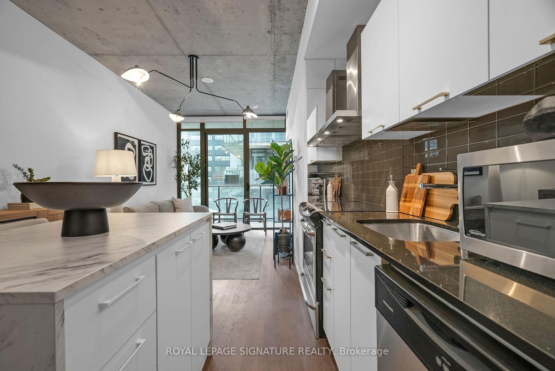 Welcome to Six50 King West Suite 804! Experience urban sophistication in the heart of King West Village, one of Torontos most vibrant and sought-after neighbourhoods. This bright and beautifully designed 1-bedroom, 1-bath residence offers effortless city living with a rare 100 sq. ft. west-facing private balcony perfect for catching sunsets or entertaining outdoors.Inside, you'll find a smart, open-concept layout that maximizes every inch of space, complete with built-in closets, hardwood floors, and a 4-piece spa-style bathroom with a full bathtub. The modern kitchen features stainless steel appliances, stone countertops, and sleek cabinetry, making it ideal for both daily living and entertaining. Perfectly positioned at King & Bathurst, you're steps from Torontos best restaurants, nightlife, boutiques, and fitness studios, plus The Well, Waterworks Food Hall, Farm Boy, and Loblaws. Enjoy unbeatable connectivity with TTC streetcars right outside your door and the upcoming KingBathurst Station (Ontario Line) just next door. Building amenities include a 24-hour concierge, fully equipped fitness centre, outdoor garden terrace, and party room. Includes stainless steel fridge, stove, built-in dishwasher, built-in microwave, stacked washer & dryer, all existing light fixtures, window coverings, and a storage locker.Welcome to a lifestyle of style, comfort, and convenience right in the heart of downtown Toronto.