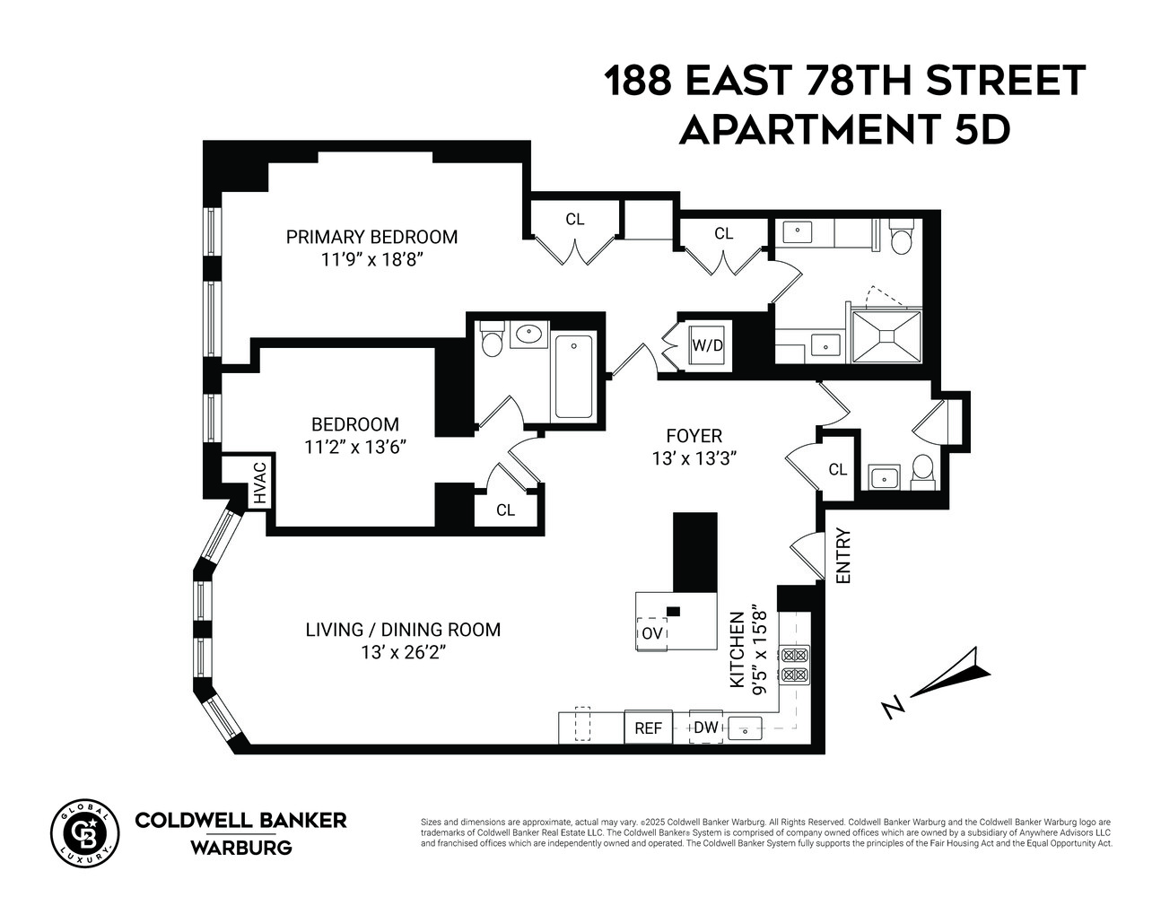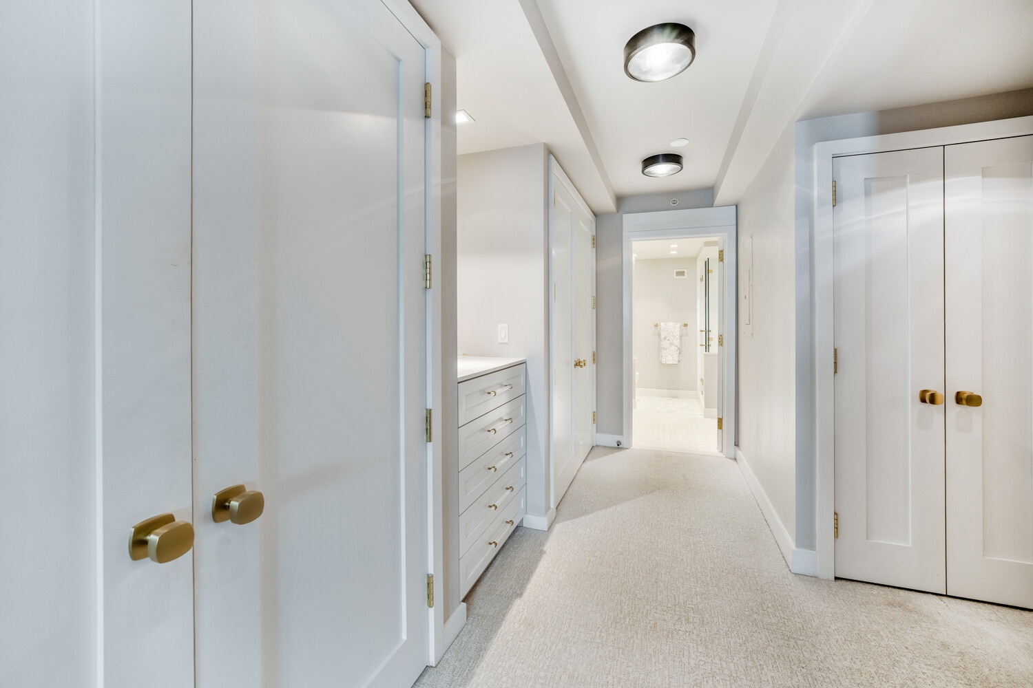 The spacious living and dining area showcases new herringbone wood floors and three large bay windows that fill the home with natural light. The luxurious primary suite offers a serene retreat with a large dressing area, an en-suite bath outfitted with double sinks, a walk-in shower, and excellent storage. The second bedroom (or study) features textured wall coverings, a custom closet, and an en-suite bath with a soaking tub and inlaid mosaic marble floors. A large, elegant powder room with statement wallpaper and a hidden storage closet adds an additional layer of convenience. The home also includes a washer and dryer.