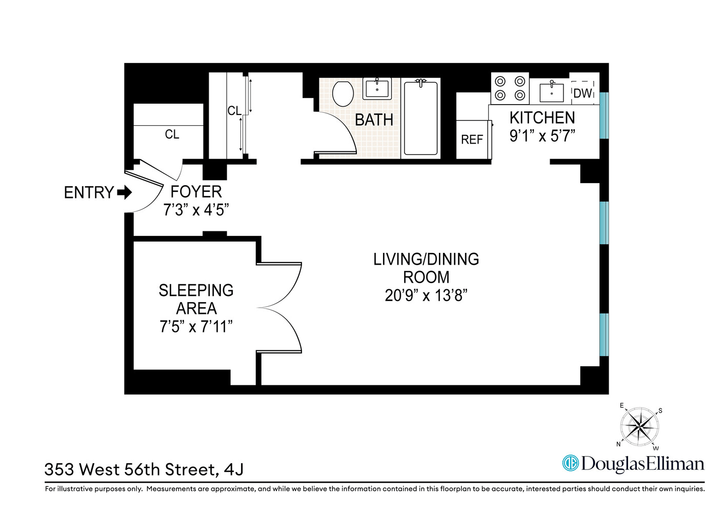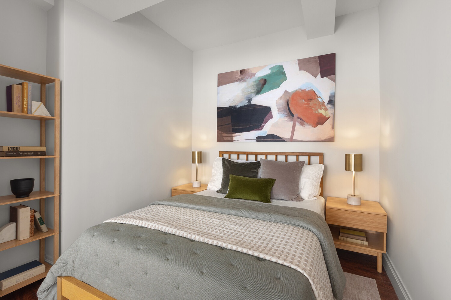 The well-appointed kitchen features modern appliances, including a dishwasher and gas range. With ample storage space, including two large walk-in closets and a bathroom with original cast-iron tub and subway tiles, this studio exudes both elegant and functional.