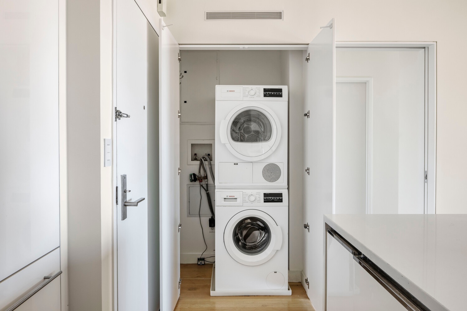 The expansive living area seamlessly integrates itself with an open chef's kitchen, featuring top-of-the-line appliances including Bertazzoni range and Bosch dishwasher, refrigerator and microwave. The spacious primary bedroom boasts an en-suite bathroom and tons of closet/storage space, including a walk-in and custom built-in; the secondary bedroom is equally well-appointed and the apartment includes a stackable W/D. Open city views enhance the living experience, offering a picturesque backdrop to your daily life.