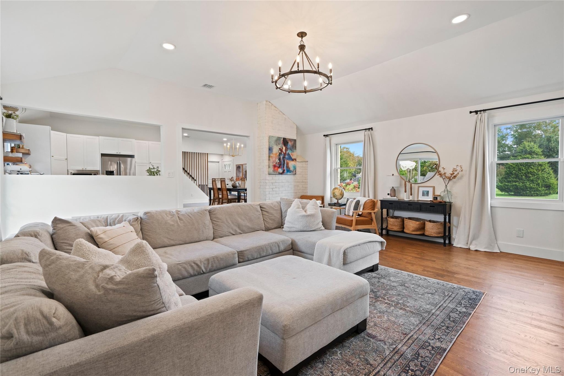 - Living room with lofted ceiling, wood finished floors, recessed lighting, and a chandelier