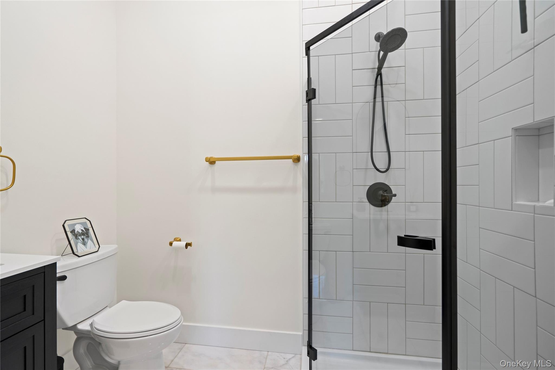 - Bathroom featuring vanity, a stall shower, and light tile patterned floors