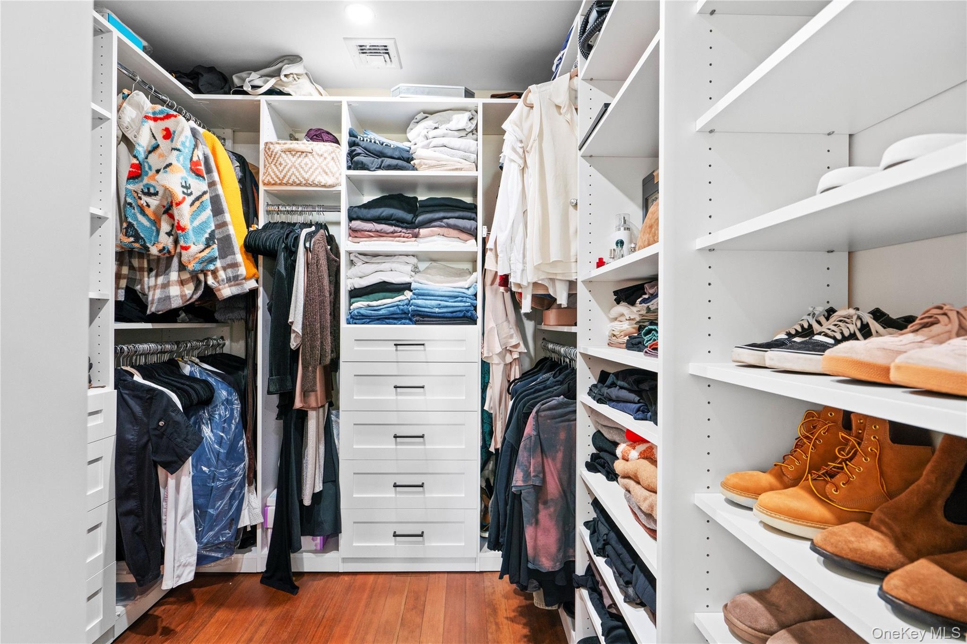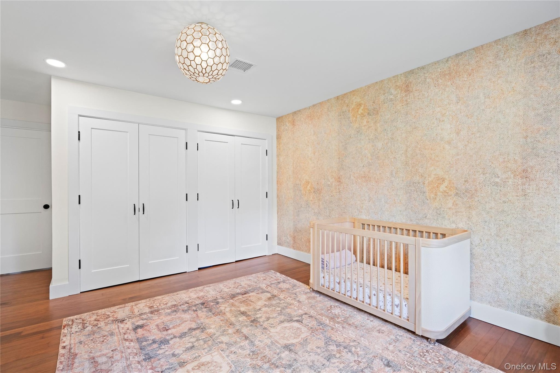 - Bedroom featuring a wall of closets with custom shelving, wood finished floors, recessed lighting, and wallpapered walls