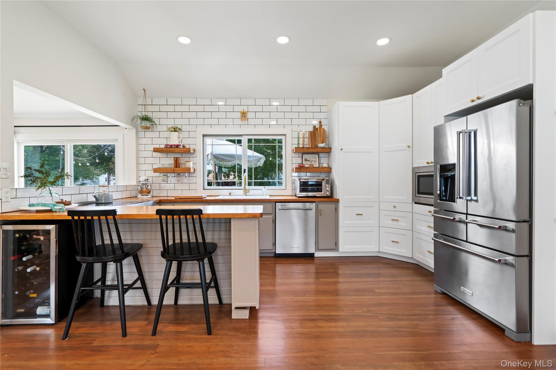 - Kitchen featuring beverage cooler, open shelves, a kitchen bar, stainless steel appliances, and recessed lighting