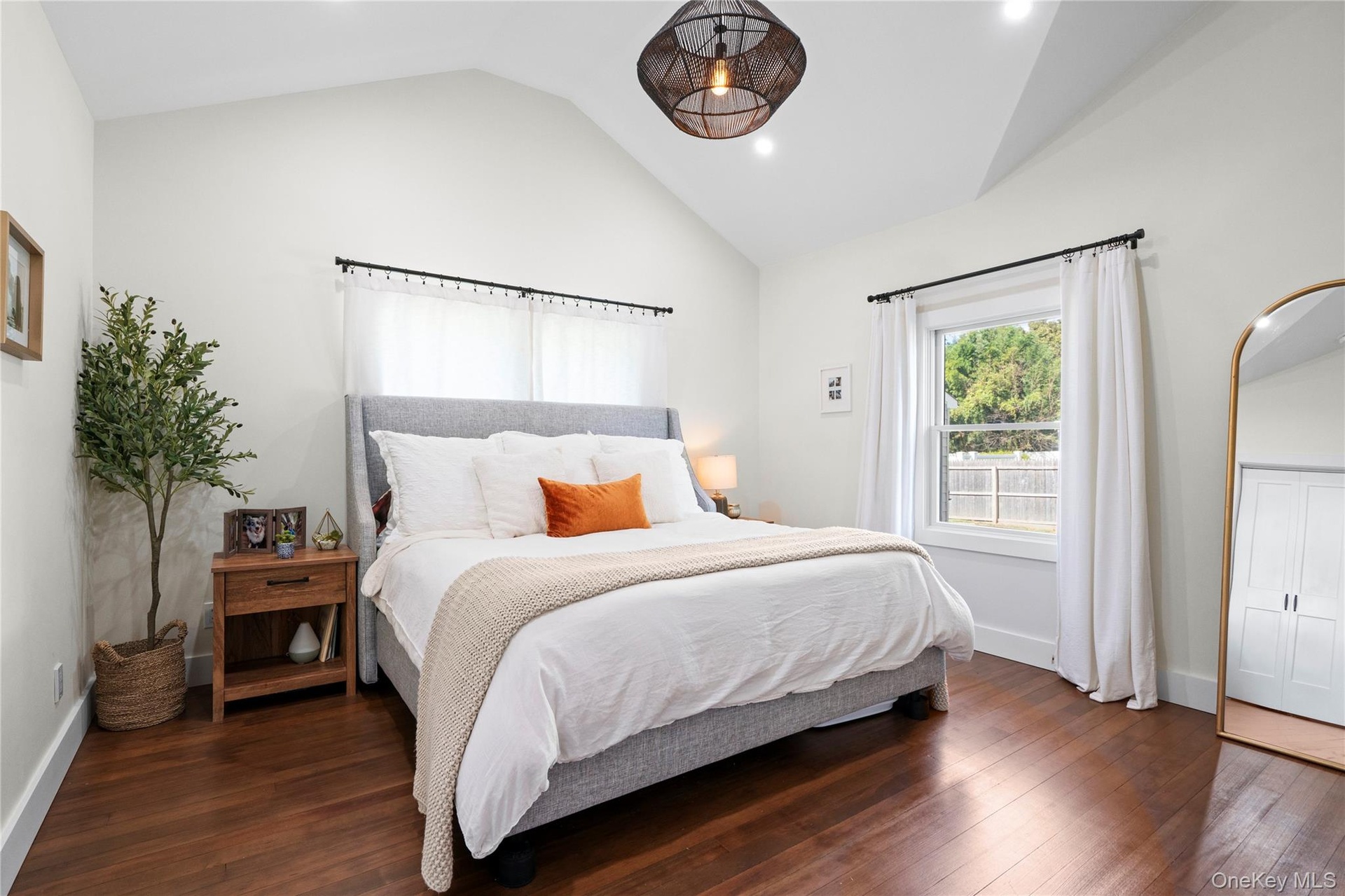 - Primary Bedroom with vaulted ceiling, wood finished floors, and recessed lighting