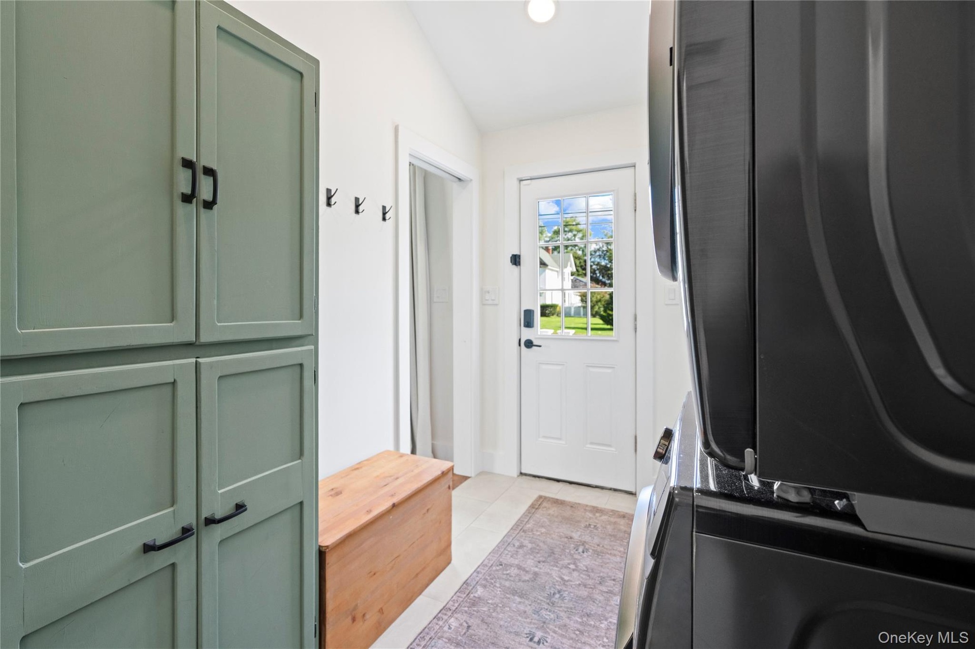 - Doorway featuring tile patterned floors, washer / clothes dryer, and recessed lighting