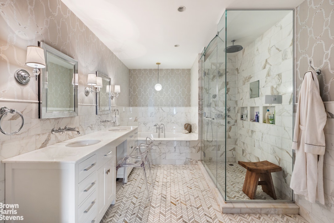 Original architectural details anchor the home, while designer upgrades introduce refinement at every turn. The kitchen is outfitted with Sub-Zero, Wolf, Bosch, and Dornbracht appliances, framed by imported marble and custom cabinetry. Spa-quality bathrooms feature Hansgrohe and Robern fixtures, bespoke finishes, and radiant design. Additional enhancements-including Sonos integration, push-button lighting, and custom millwork throughout-deliver a truly turnkey home.