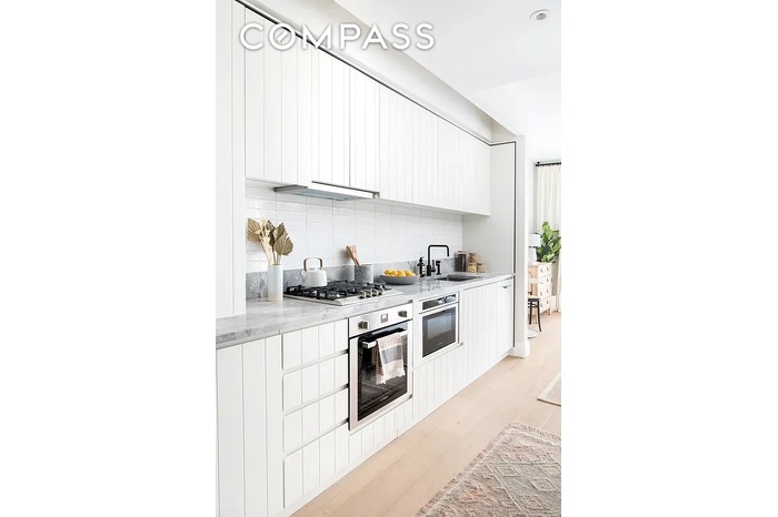 The sleek, modern kitchen features paneled cabinetry, marble countertops, and premium Bosch appliances—including an integrated refrigerator and cooktop—designed for both everyday cooking and effortless entertaining. The spa-like bathroom offers refined finishes, a calm ambiance, and excellent built-in storage, while multiple closets throughout ensure everything has its place. A washer/dryer is conveniently tucked away in-unit.