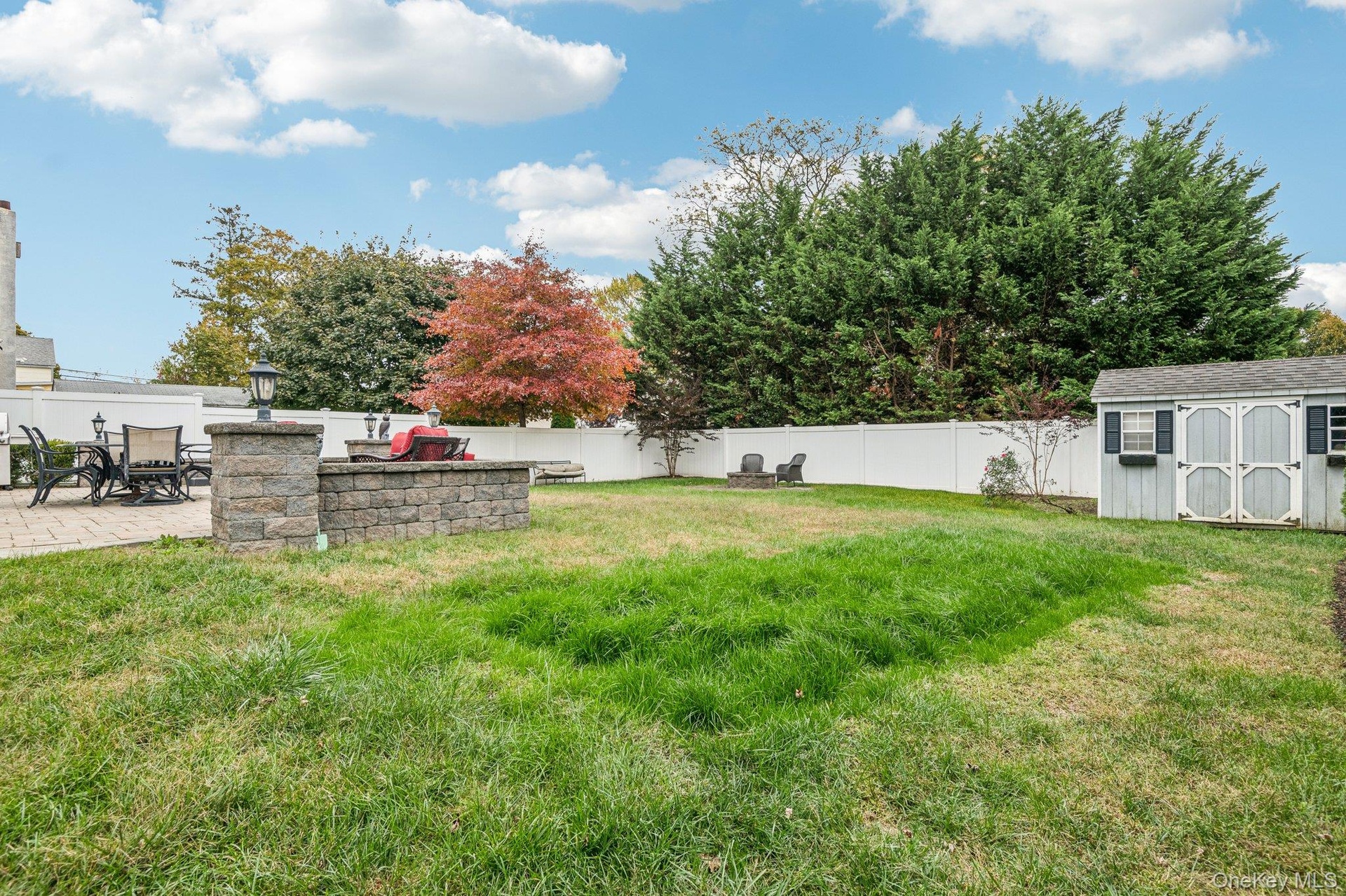 - Fenced backyard with a storage unit and a patio area