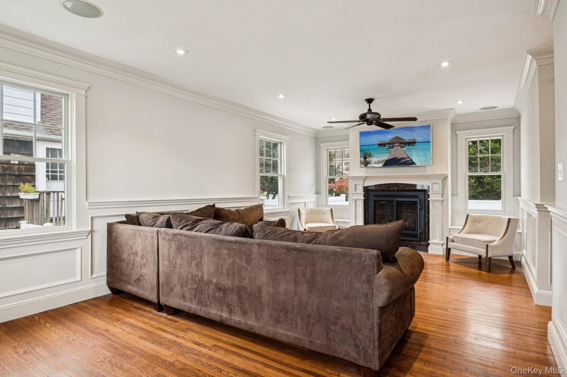 - Living area featuring a fireplace, ornamental molding, wood finished floors, recessed lighting, and ceiling fan