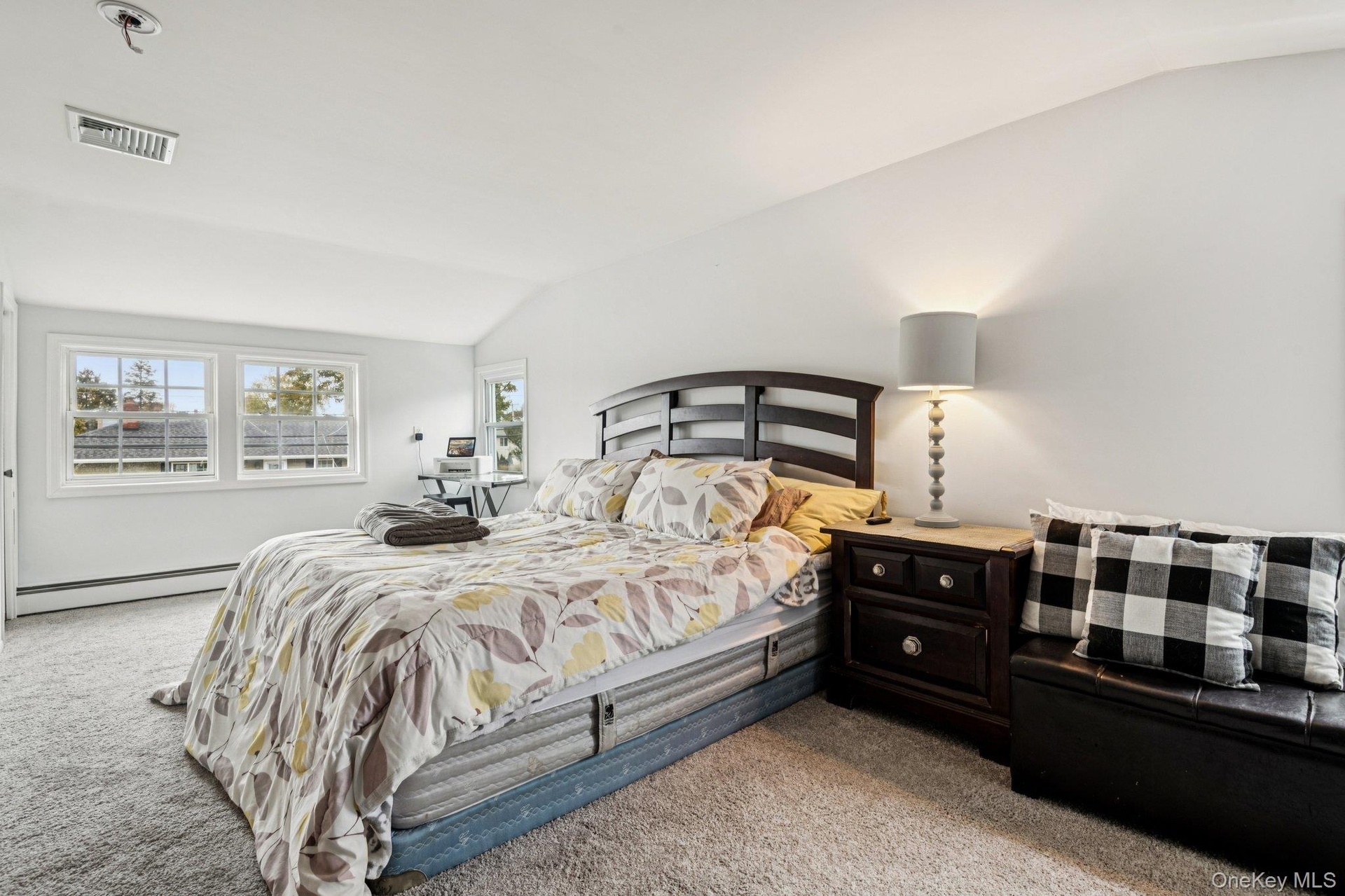 - Carpeted bedroom with vaulted ceiling and a baseboard heating unit