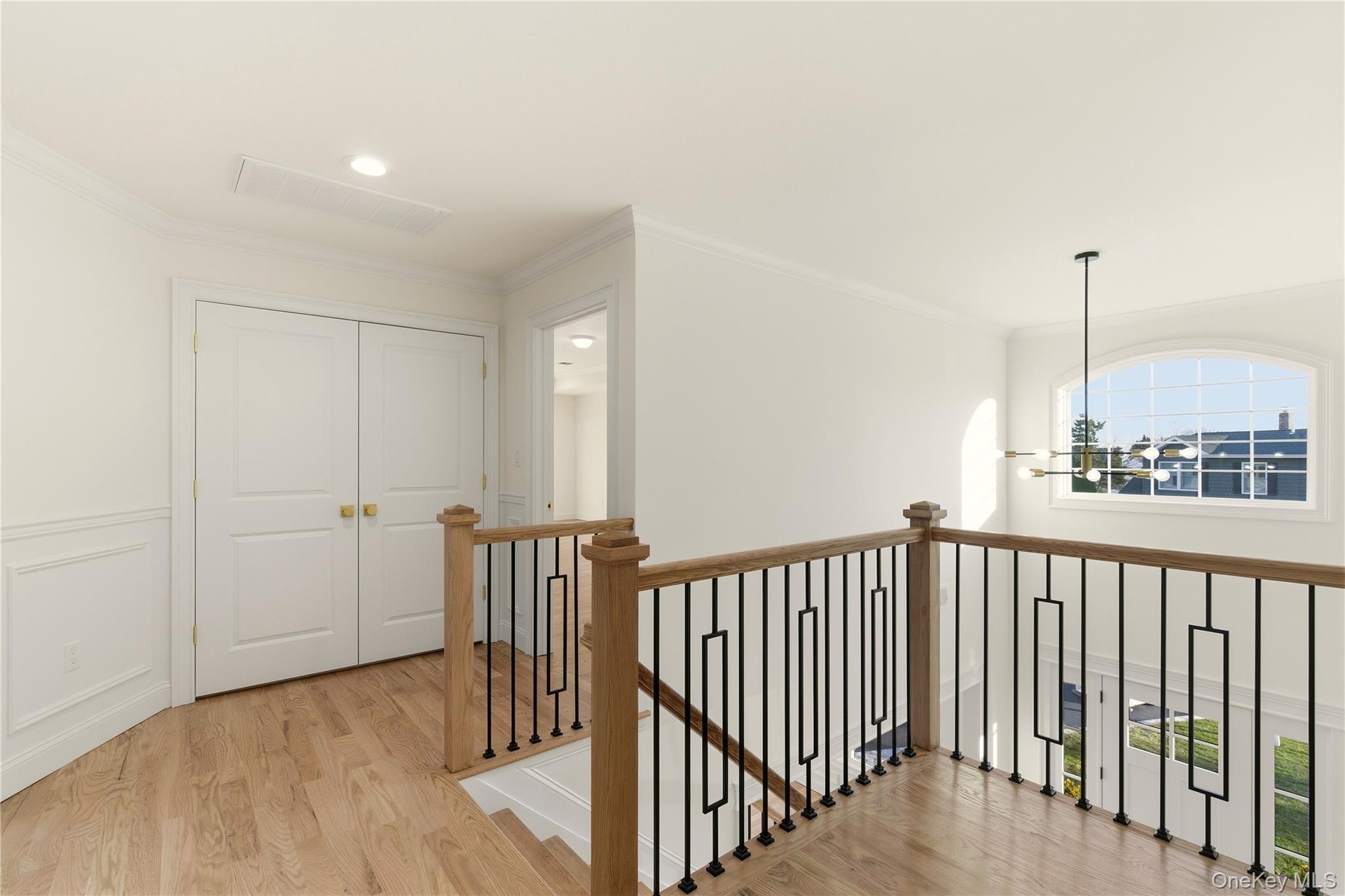 - Hallway with an upstairs landing, light wood-style flooring, crown molding, a chandelier, and a wainscoted wall