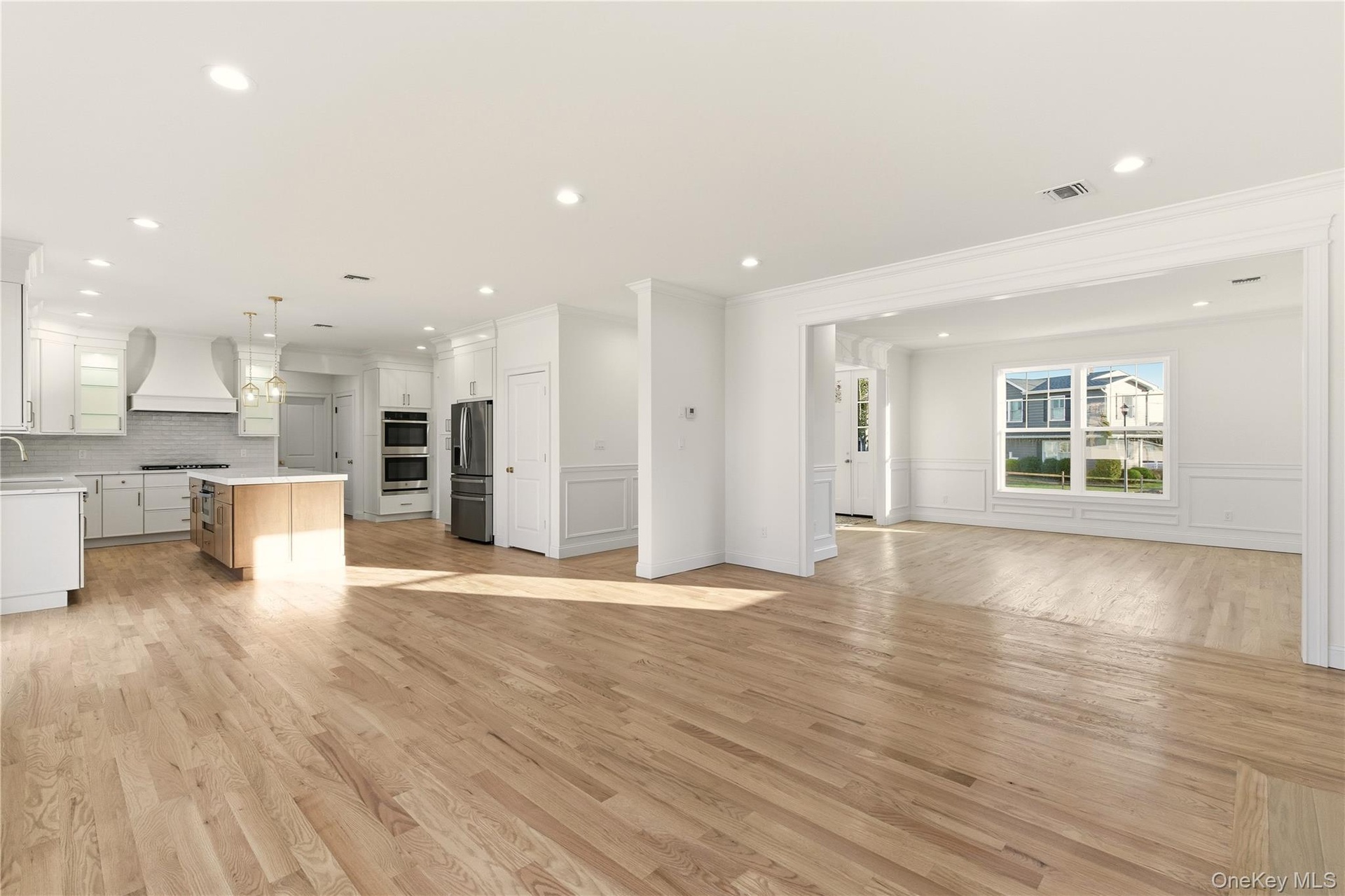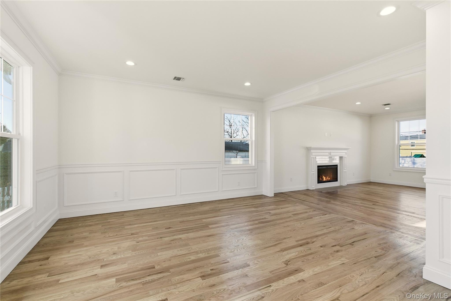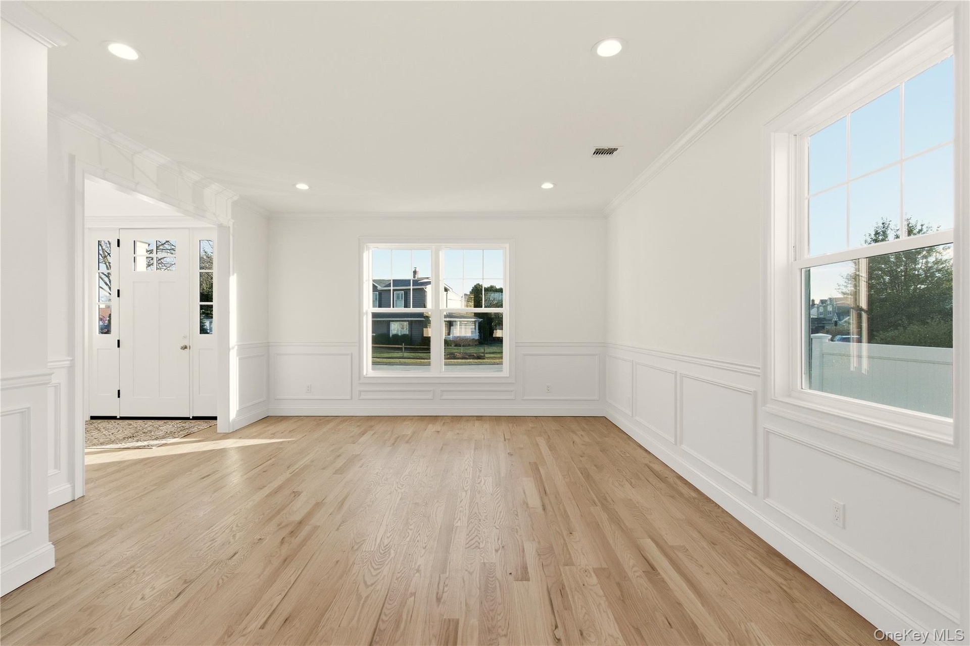 - Unfurnished living room with wainscoting, light wood-style floors, a decorative wall, and ornamental molding