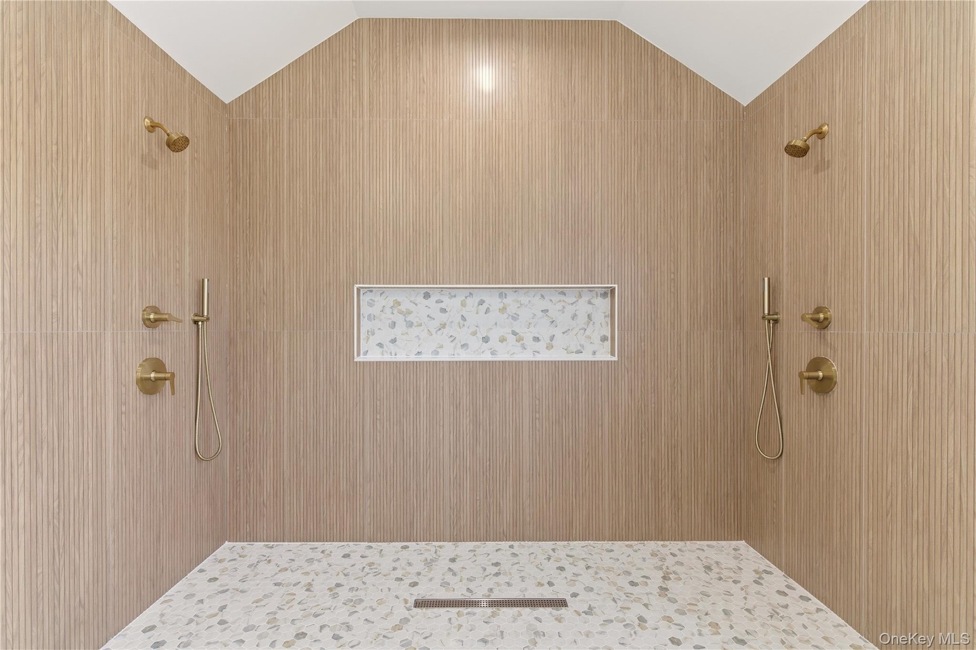 - Bathroom with walk in shower, vaulted ceiling, double vanity, a freestanding tub, and light marble finish flooring