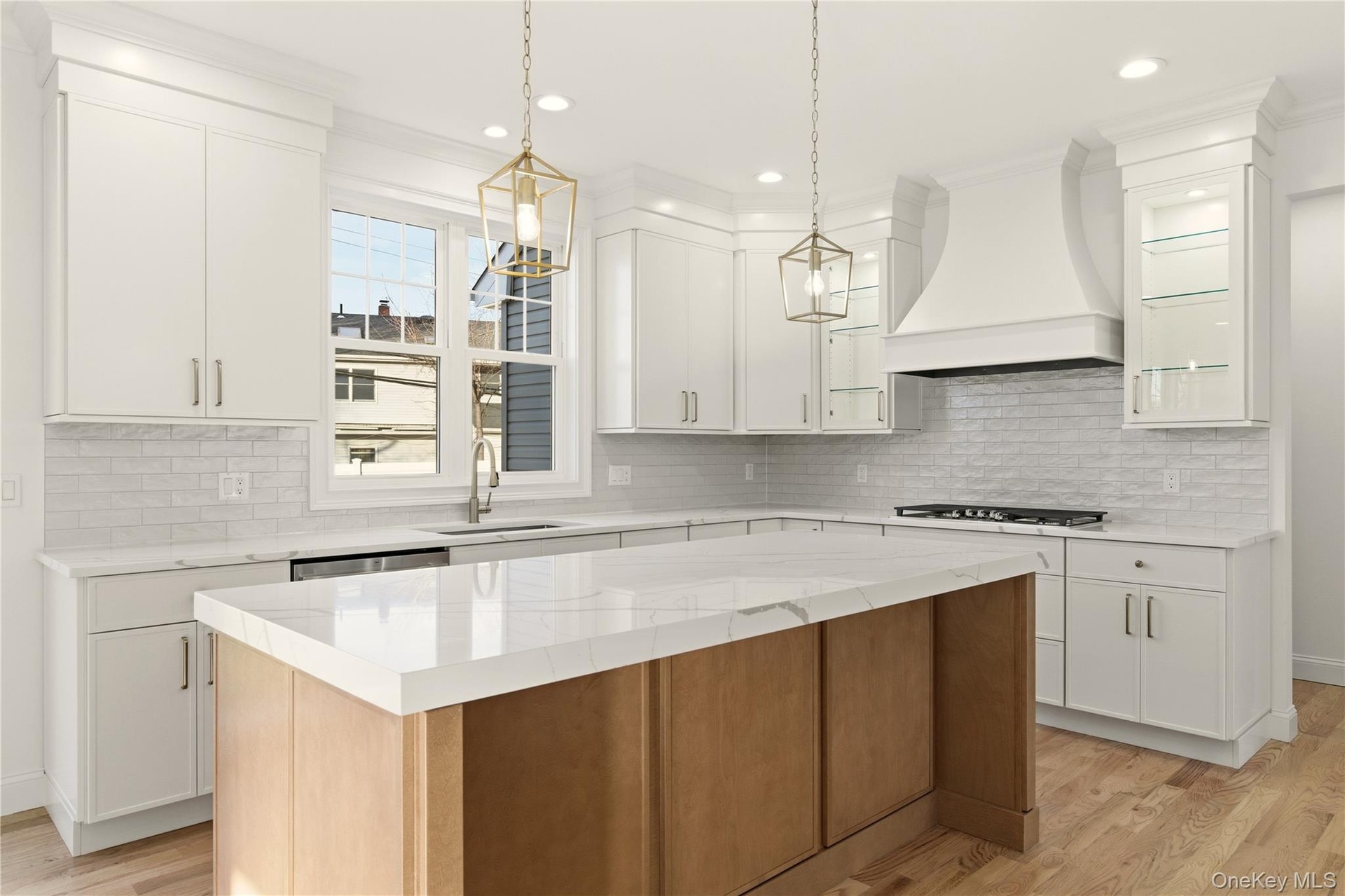 - Kitchen with decorative light fixtures, a center island, custom range hood, light wood-style floors, and decorative backsplash