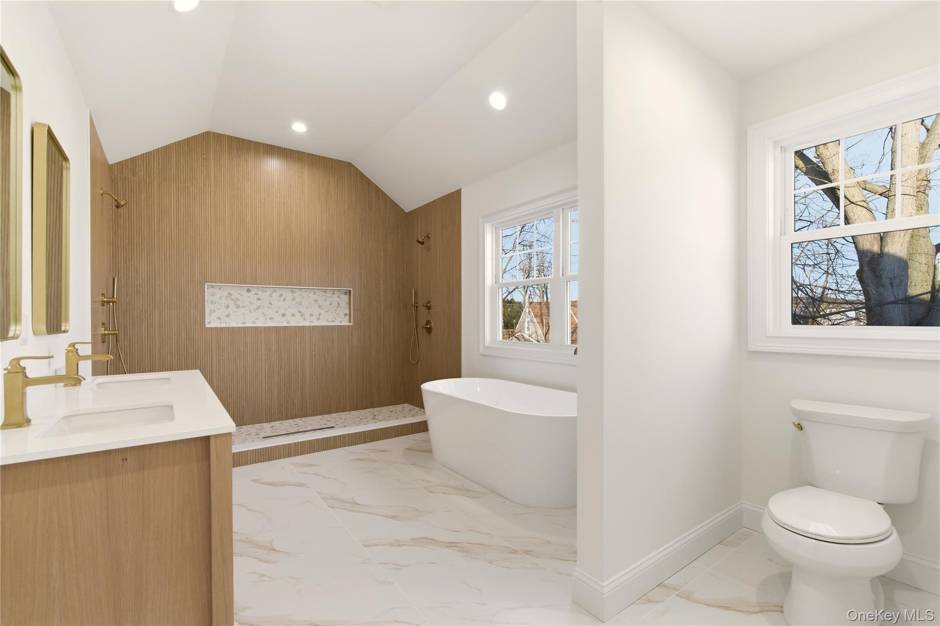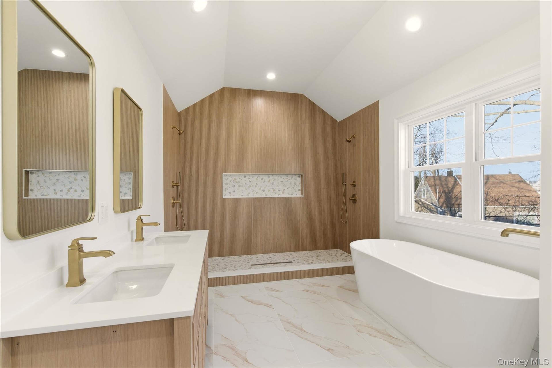 - Full bathroom with lofted ceiling, walk in shower, a freestanding bath, double vanity, and recessed lighting