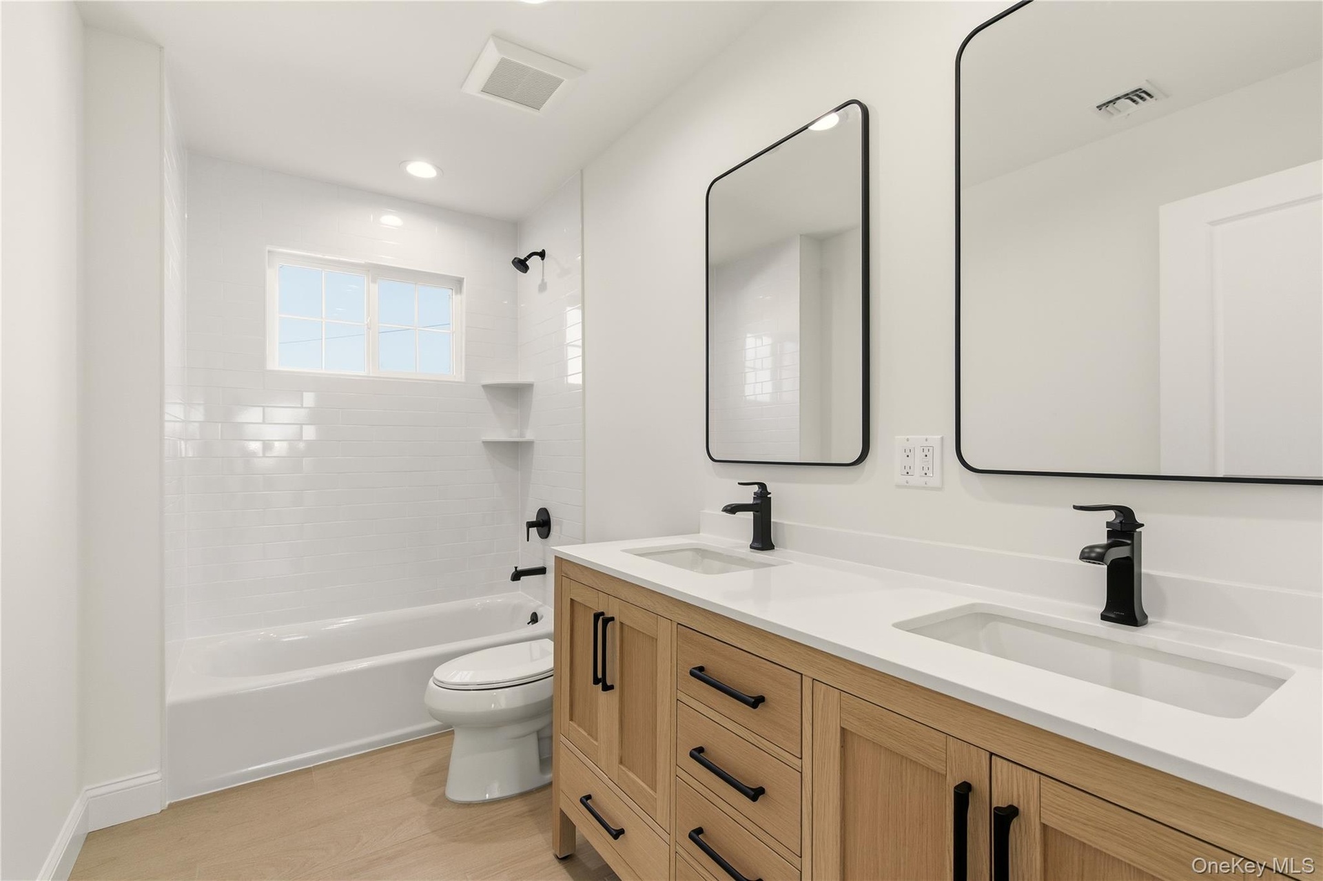 - Full bath with double vanity, shower combination, light wood-type flooring, and recessed lighting