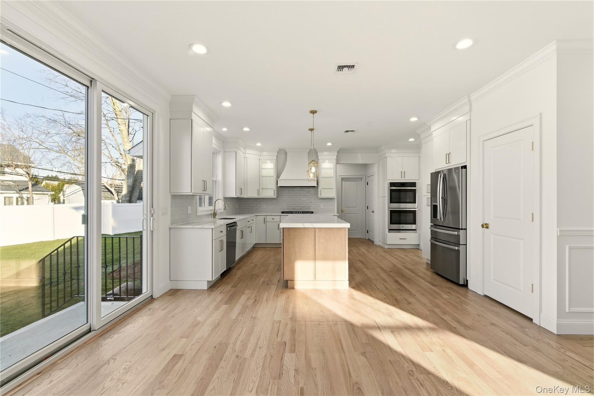 - Kitchen featuring ornamental molding, a center island, hanging light fixtures, stainless steel appliances, and white cabinets