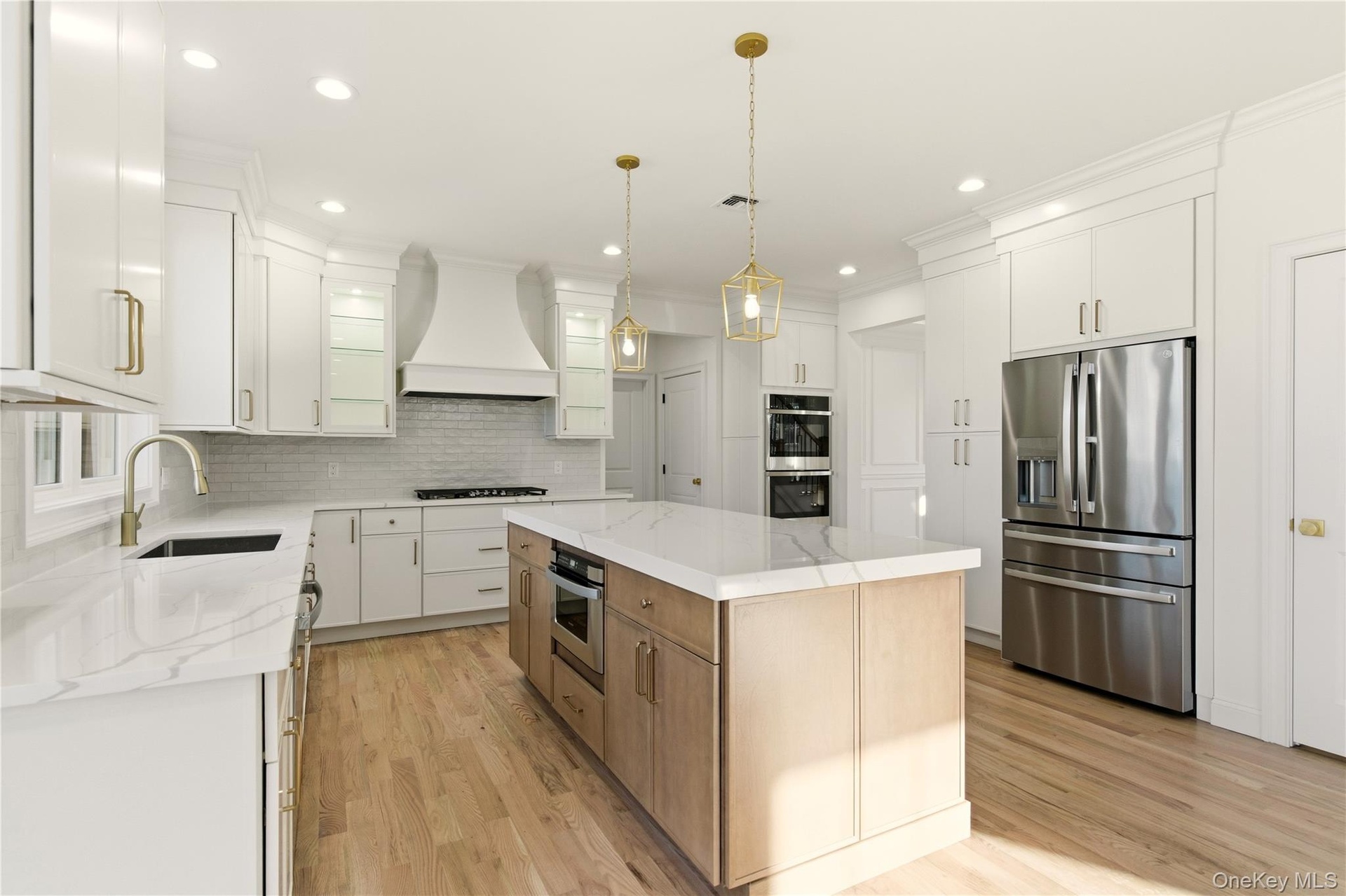 - Kitchen with stainless steel appliances, glass insert cabinets, a center island, light stone counters, and custom exhaust hood