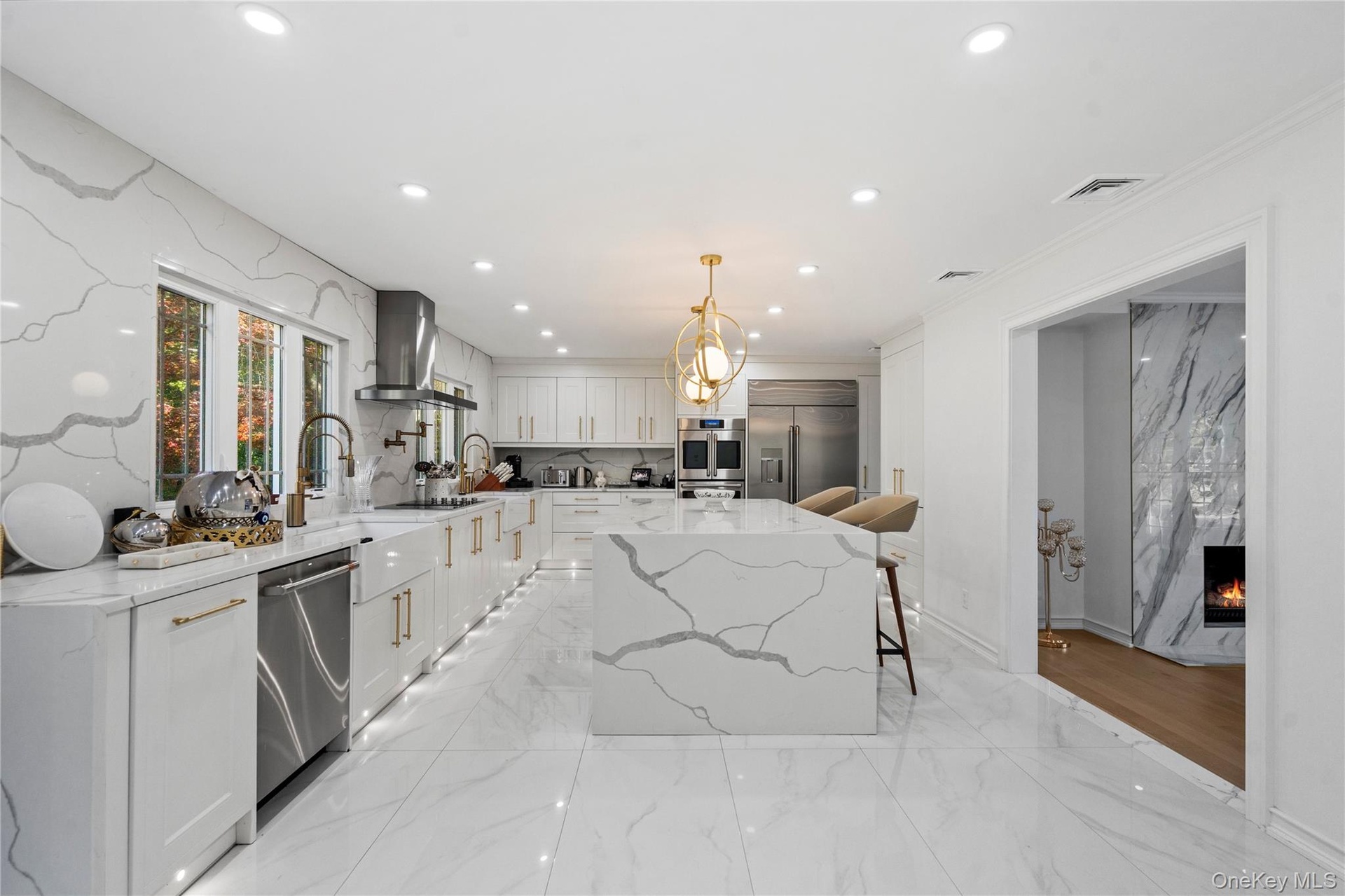 After driving up a tree-lined circular driveway and walking past a striking Japanese maple, guests will be impressed by the new Pella windows, classic front portico, and new, imported front door. It opens to a bright and airy foyer with bridal staircase displaying an elegant wrought-iron-filigree balustrade. Gleaming porcelain floors flow into the rear hall that opens to the rear patio and to an exquisite new powder room. A wide doorway leads into the spacious living room, illuminated by large front and rear windows, LED lighting, and featuring new white oak hardwood floors and French doors opening to a spacious loggia. Adjoining the foyer, a cheery breakfast area has similar floors that flow into the chef’s dream kitchen and light up when stepped upon. Ideal for entertaining, the sleek kitchen offers extensive cabinetry, a large waterfall center island, two workstations with farm sinks beneath triple windows, and high-end Cafe stainless steel appliances that include two wall ovens, large refrigerator/freezer with in-door ice and water, two dishwasher, beverage cooler, and glass cooktop with hood and pot filler. The adjoining, elegant, banquet-sized dining room is filled with sunny views of the backyard through a wall of windows and French doors to the rear stone patio, an ideal place for al fresco dining. A wood-burning fireplace, faced in marble-like porcelain, adds a dramatic focal point to the space. Also, off the kitchen is a well-equipped laundry/mudroom (new washer and dryer), with entry to the attached two-car garage.