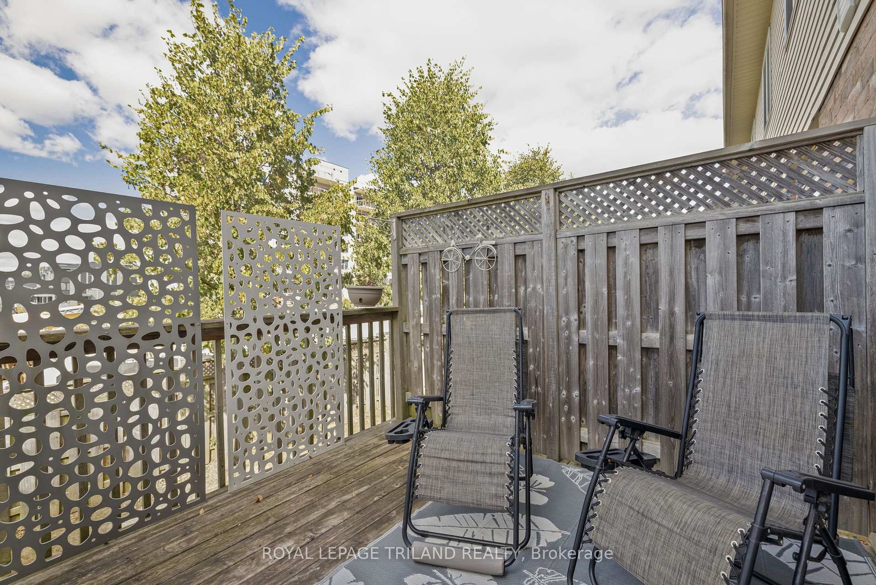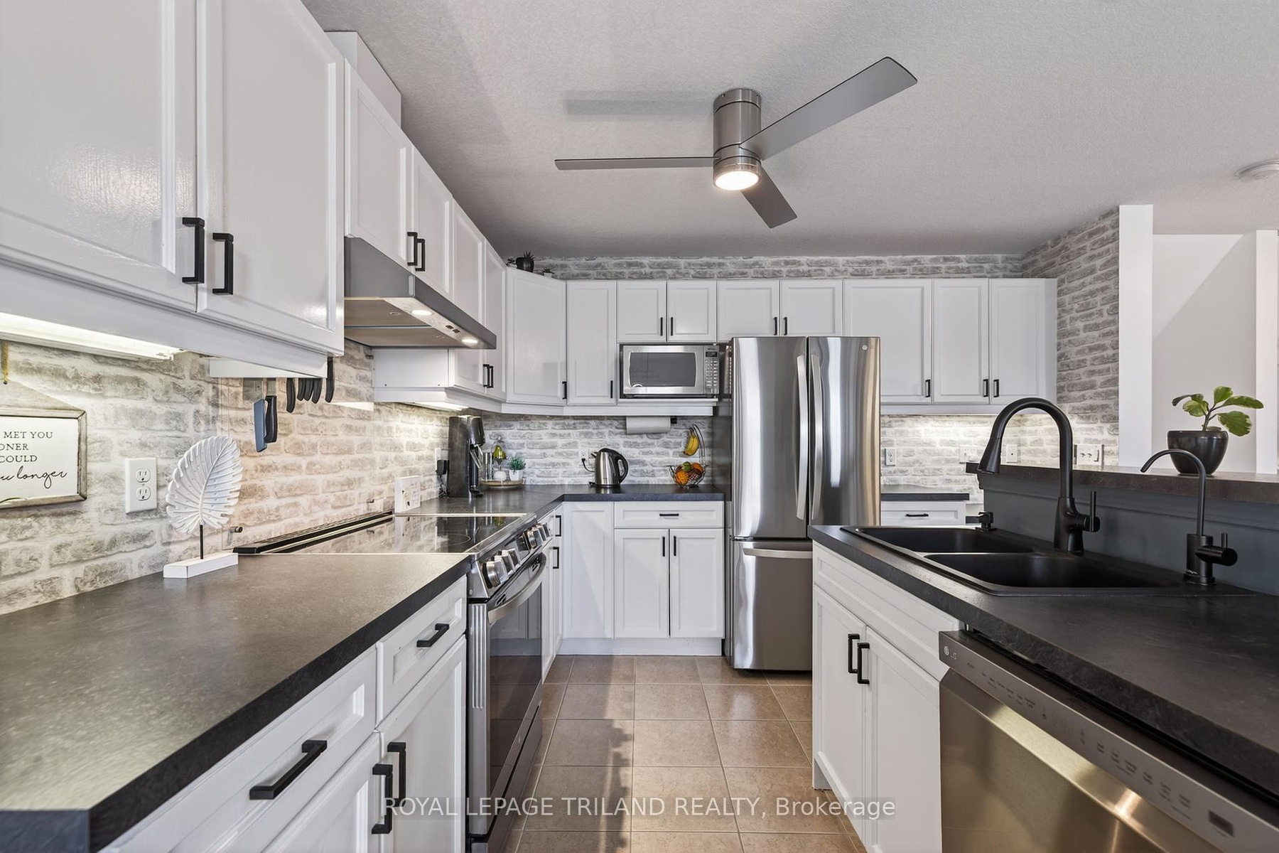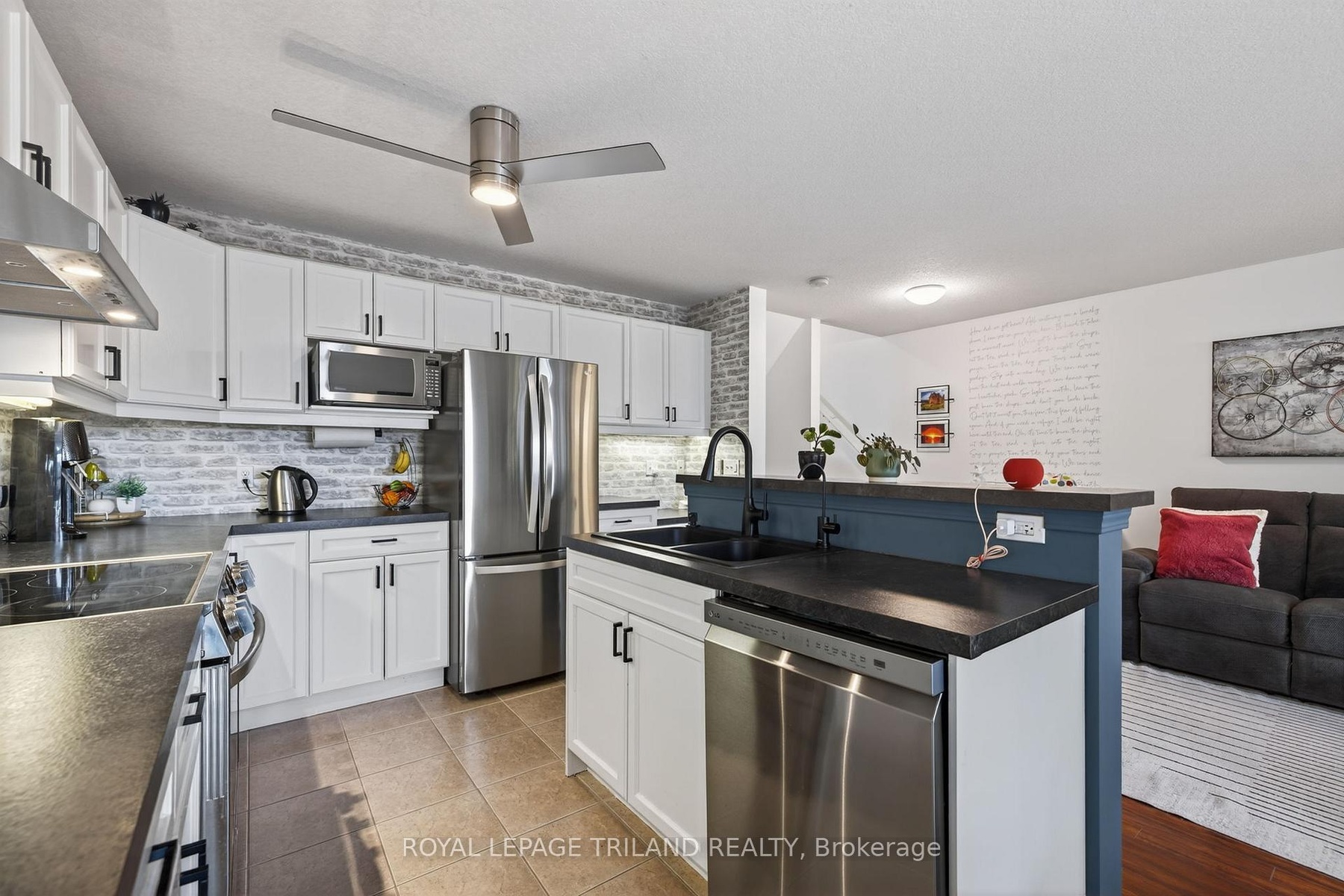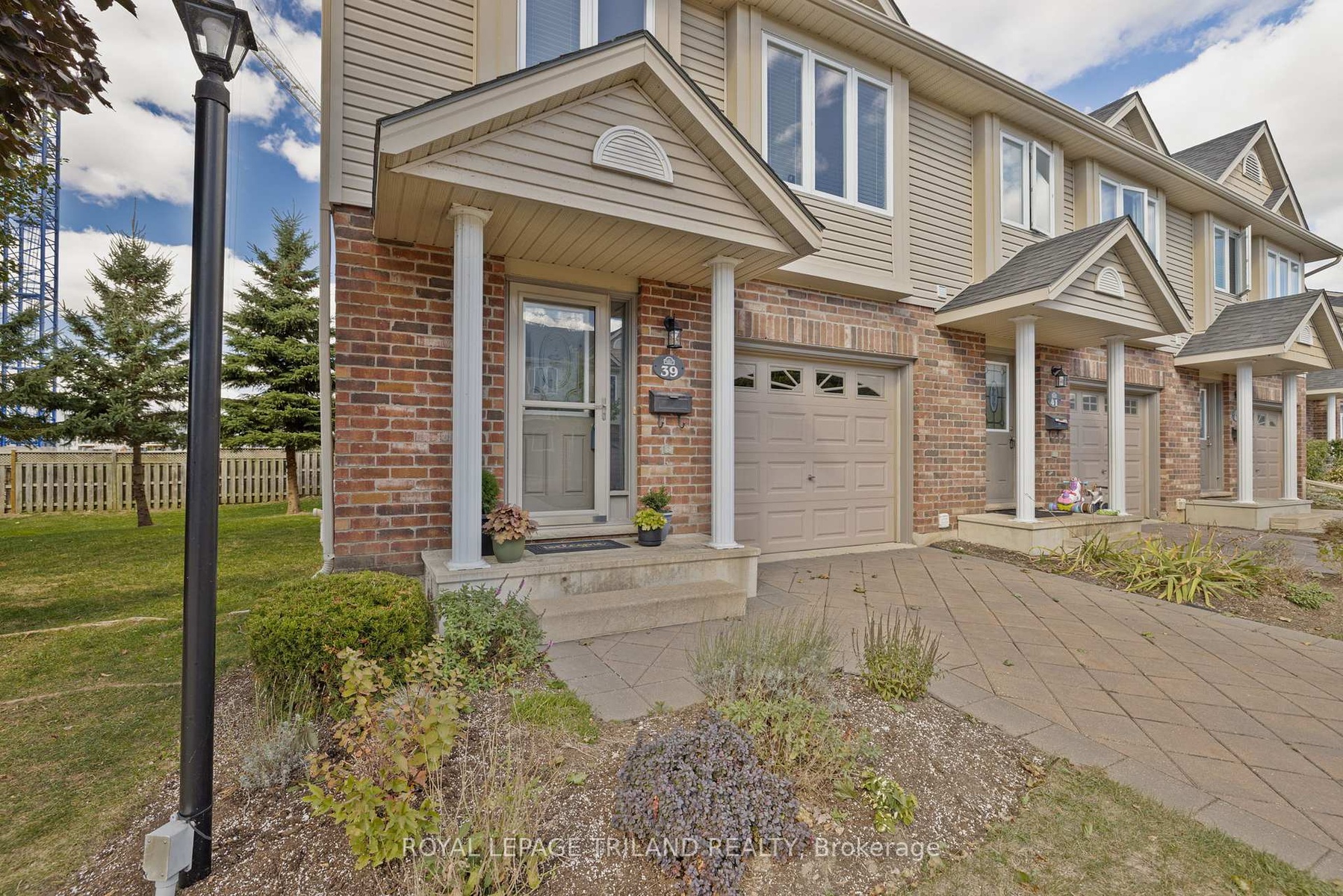 Welcome to 1625 Purser Street, Unit 39, a stylish multi-level end unit condominium in Northeast London's sought-after Wyngate community by Rembrandt Homes. Originally constructed in 2009, this popular 'Westerdam' floor plan offers the perfect blend of modern comfort and low-maintenance living. Step inside to a bright and spacious foyer with direct access to the single car garage, and a convenient 2 piece bath. Just a few steps up, the open concept living, kitchen, and dining areas create the perfect space for everyday living and entertaining. The living room is finished in laminate flooring, while the kitchen and dining area feature ceramic tile and a brick patterned accent wall that adds a touch of character. The crisp white cabinetry, updated countertops, black granite sink, and high end stainless steel appliances make this kitchen as functional as it is stylish. From the kitchen, step out to your elevated sundeck, ideal for morning coffee or that evening meal. Back inside, continue up to your private primary retreat, a spacious king sized bedroom complete with a massive south facing window, generous closet space, and a 3 piece ensuite. The top level offers two additional bedrooms and a 4 piece bath, ideal for family, guests, or a home office setup. The lower level features a bright rec room finished in luxury vinyl plank flooring, with a large above grade window and a handy laundry closet. The lowest level provides plenty of extra storage and utility space, ensuring every inch of the home is put to good use. Enjoy the ease of maintenance free condo living in a prime location, just minutes to shopping, restaurants, London Airport, Masonville Mall, Western University, Fanshawe College and major transit routes. With its modern layout, natural light, and move in ready condition, this end unit offers the perfect balance of style, comfort, and convenience. Experience effortless living at its best, welcome home to Purser Street!