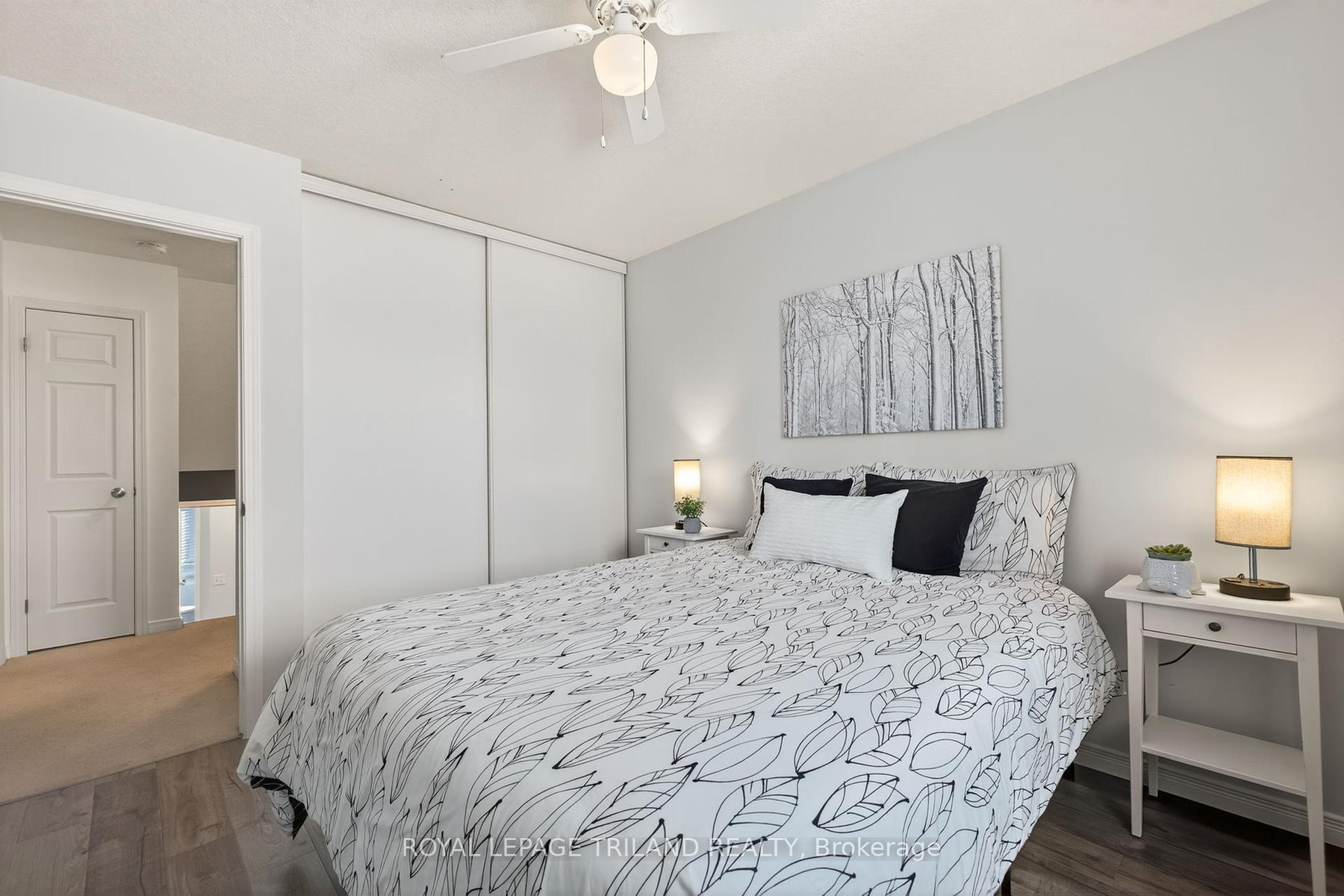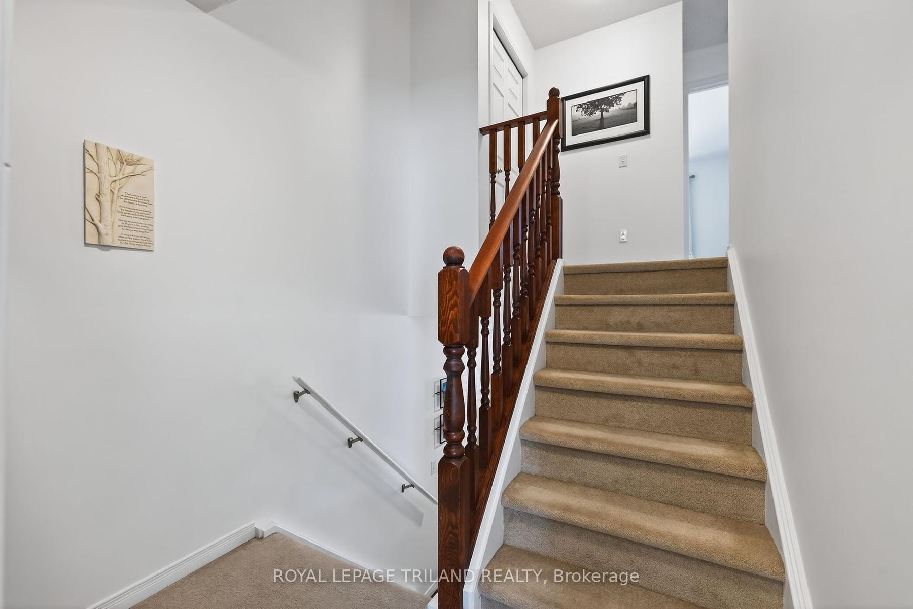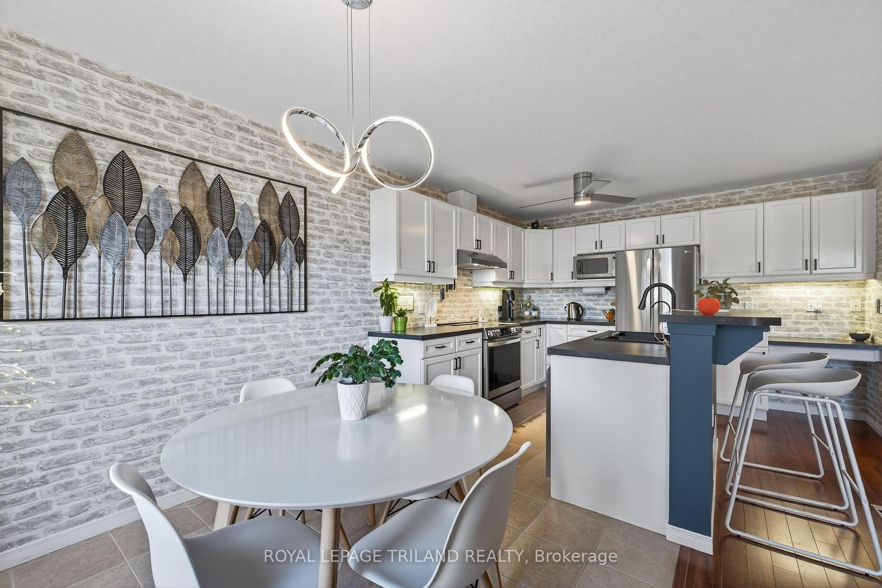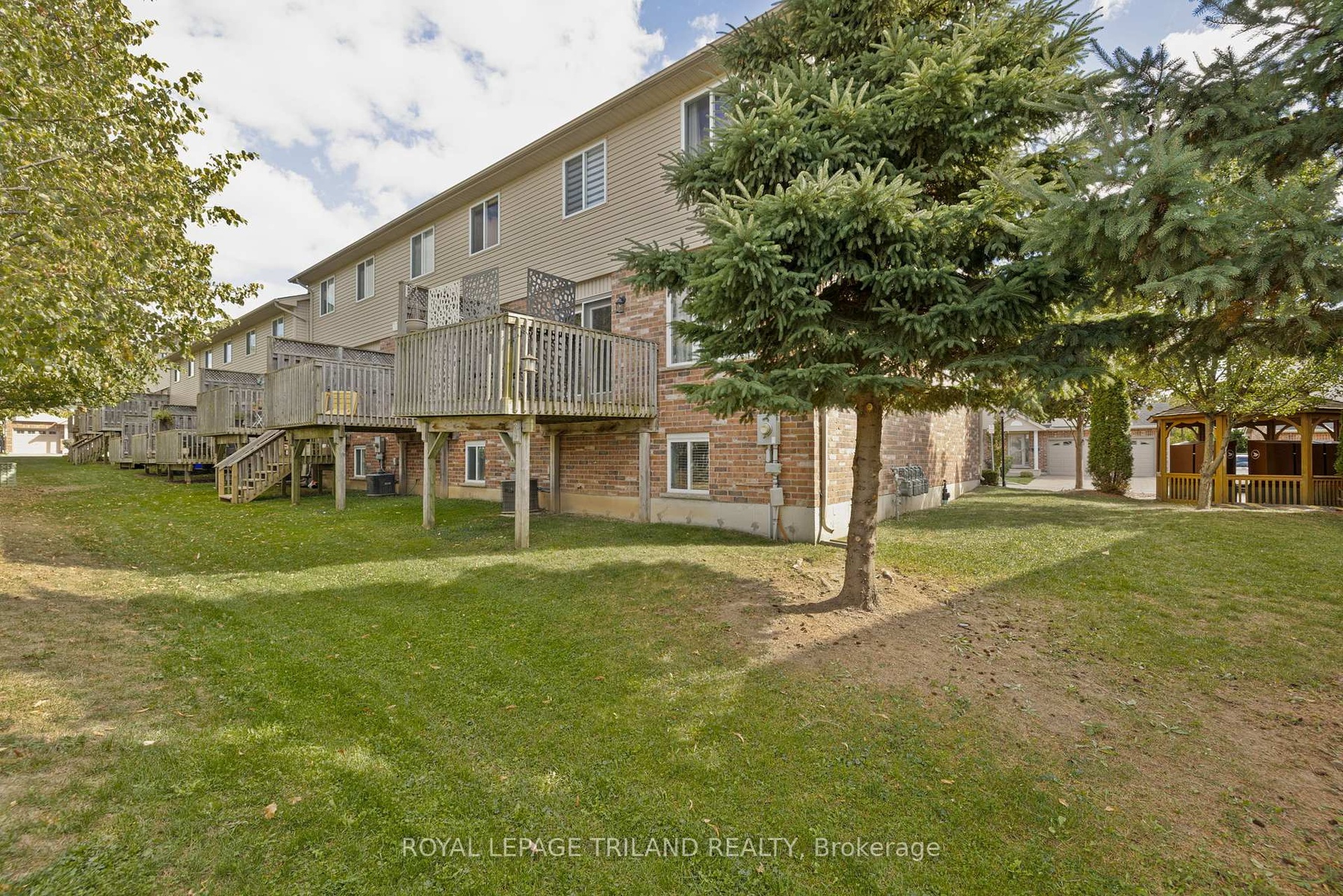 Welcome to 1625 Purser Street, Unit 39, a stylish multi-level end unit condominium in Northeast London's sought-after Wyngate community by Rembrandt Homes. Originally constructed in 2009, this popular 'Westerdam' floor plan offers the perfect blend of modern comfort and low-maintenance living. Step inside to a bright and spacious foyer with direct access to the single car garage, and a convenient 2 piece bath. Just a few steps up, the open concept living, kitchen, and dining areas create the perfect space for everyday living and entertaining. The living room is finished in laminate flooring, while the kitchen and dining area feature ceramic tile and a brick patterned accent wall that adds a touch of character. The crisp white cabinetry, updated countertops, black granite sink, and high end stainless steel appliances make this kitchen as functional as it is stylish. From the kitchen, step out to your elevated sundeck, ideal for morning coffee or that evening meal. Back inside, continue up to your private primary retreat, a spacious king sized bedroom complete with a massive south facing window, generous closet space, and a 3 piece ensuite. The top level offers two additional bedrooms and a 4 piece bath, ideal for family, guests, or a home office setup. The lower level features a bright rec room finished in luxury vinyl plank flooring, with a large above grade window and a handy laundry closet. The lowest level provides plenty of extra storage and utility space, ensuring every inch of the home is put to good use. Enjoy the ease of maintenance free condo living in a prime location, just minutes to shopping, restaurants, London Airport, Masonville Mall, Western University, Fanshawe College and major transit routes. With its modern layout, natural light, and move in ready condition, this end unit offers the perfect balance of style, comfort, and convenience. Experience effortless living at its best, welcome home to Purser Street!
