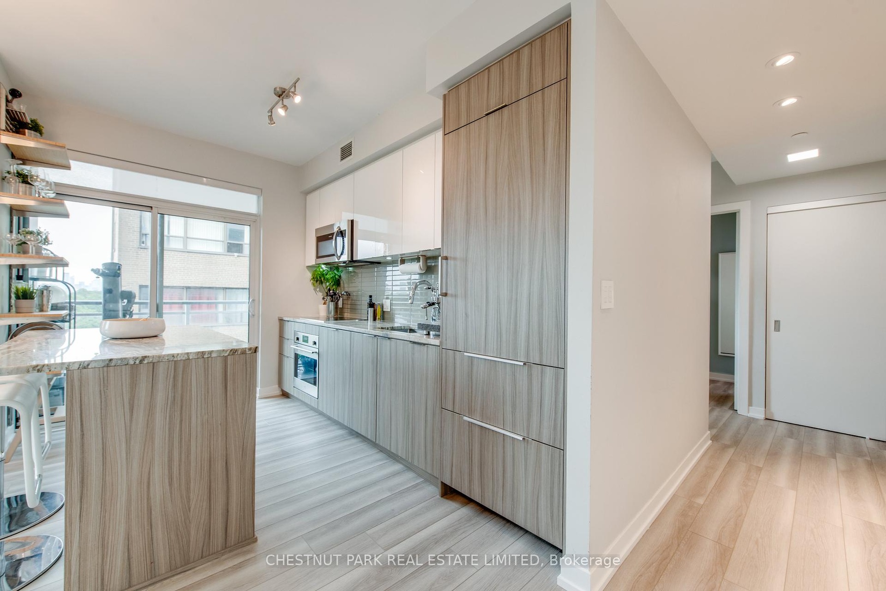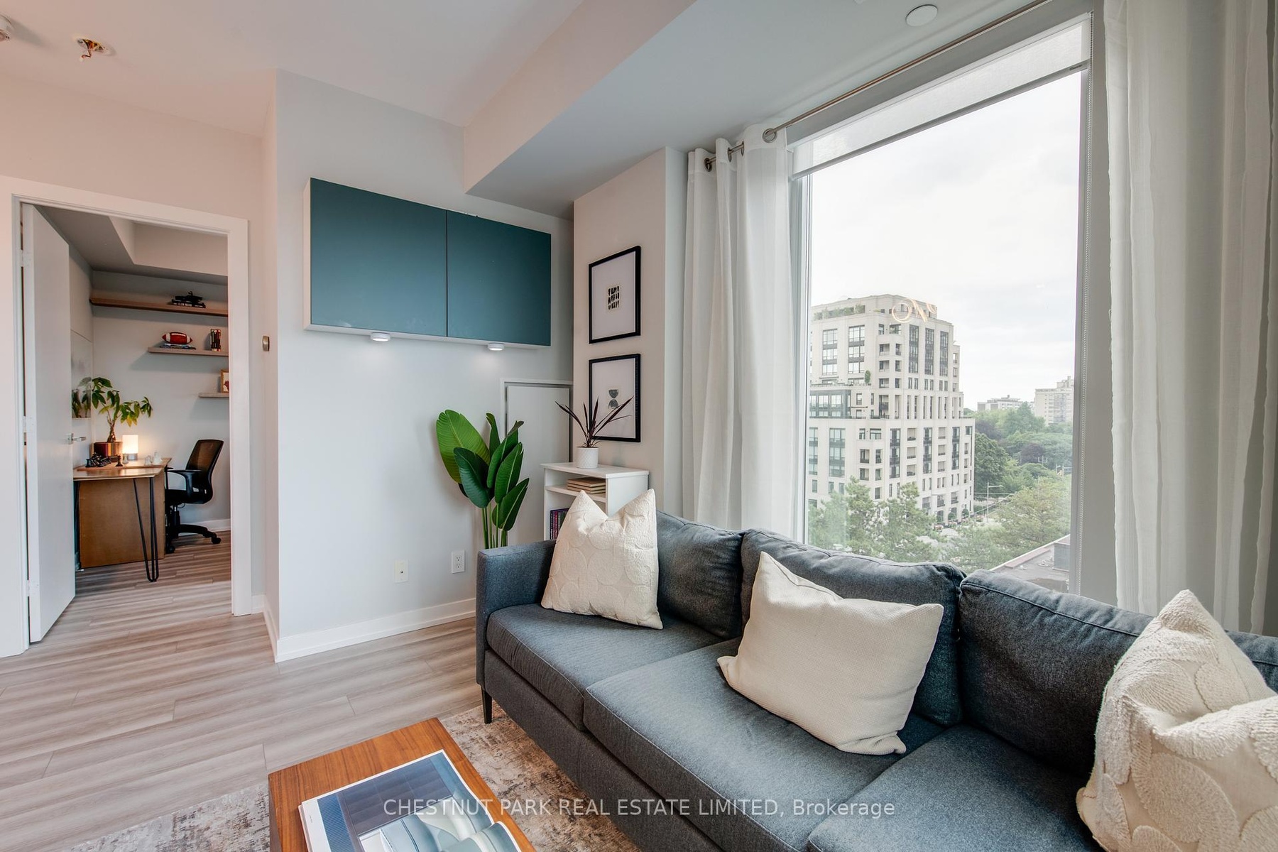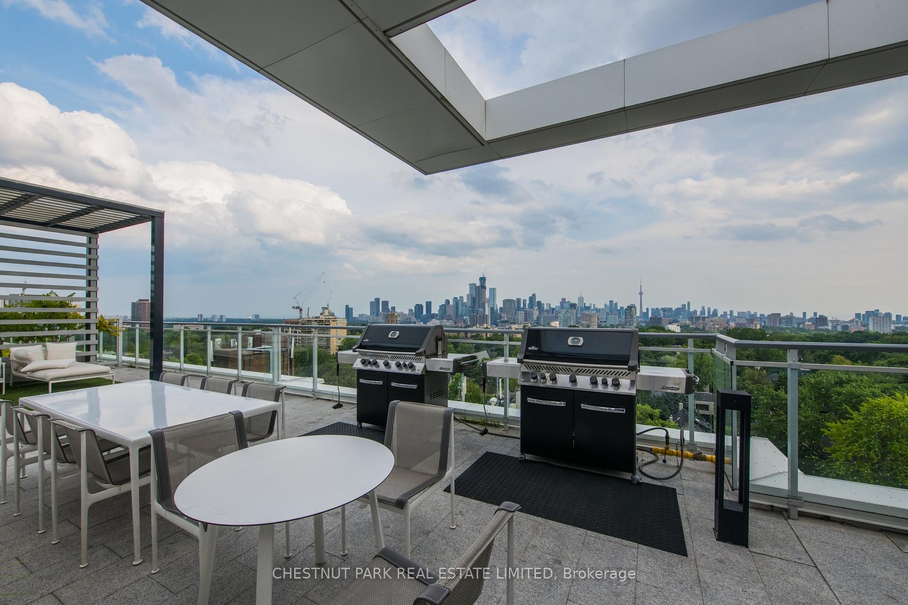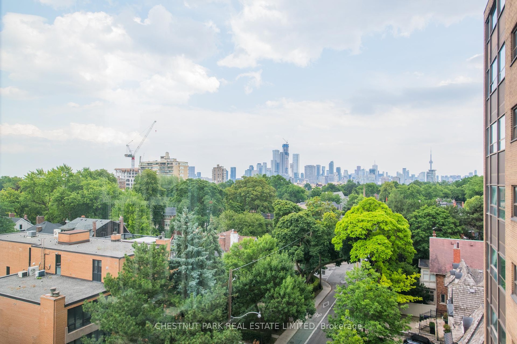 This is the luxury space you've envisioned living in, where timeless elegance meets contemporary design in the heart of Toronto's historic Casa Loma neighbourhood. This impeccably upgraded, rarely available south-and-east-facing 2-bedroom + den, 2-bathroom sun-infused corner residence at the distinguished boutique Zigg Condos offers 908 square feet of refined interior space, complemented by a 102 sq ft balcony - capturing the city's panoramic skyline, serene treetop views, and glorious sunrises. A thoughtfully designed open-concept layout and desirable split-bedroom plan feature floor-to-ceiling windows, new wide-plank flooring, and a sleek, modern kitchen with integrated Sub-Zero and Blomberg appliances, natural stone countertops, and upscale cabinetry. The spacious living and dining areas flow seamlessly to the balcony, featuring upgraded outdoor flooring, creating a bright and sophisticated space ideal for entertaining or relaxing. The primary suite can accommodate a king-size bed, with ample closet space and a spa-inspired ensuite. A second bedroom and enclosed den offer versatility for guests or a beautifully designed home office. One parking space and one locker are included, offering both convenience and added value. Zigg Condos offers a boutique lifestyle with premium amenities, including a 24-hour concierge, a fully equipped fitness centre, a rooftop terrace with BBQs and skyline views, a stylish party/meeting room, and visitor parking. Ideally located just south of Forest Hill Village, steps to St. Clair West subway, top-rated schools, grocers, parks, ravines, and some of Toronto's most cherished restaurants, cafes, and boutiques. This is not simply a place to call home - it's an elevated urban experience in one of the city's most exclusive, high-demand, and low-turnover buildings in one of the most coveted neighbourhoods.