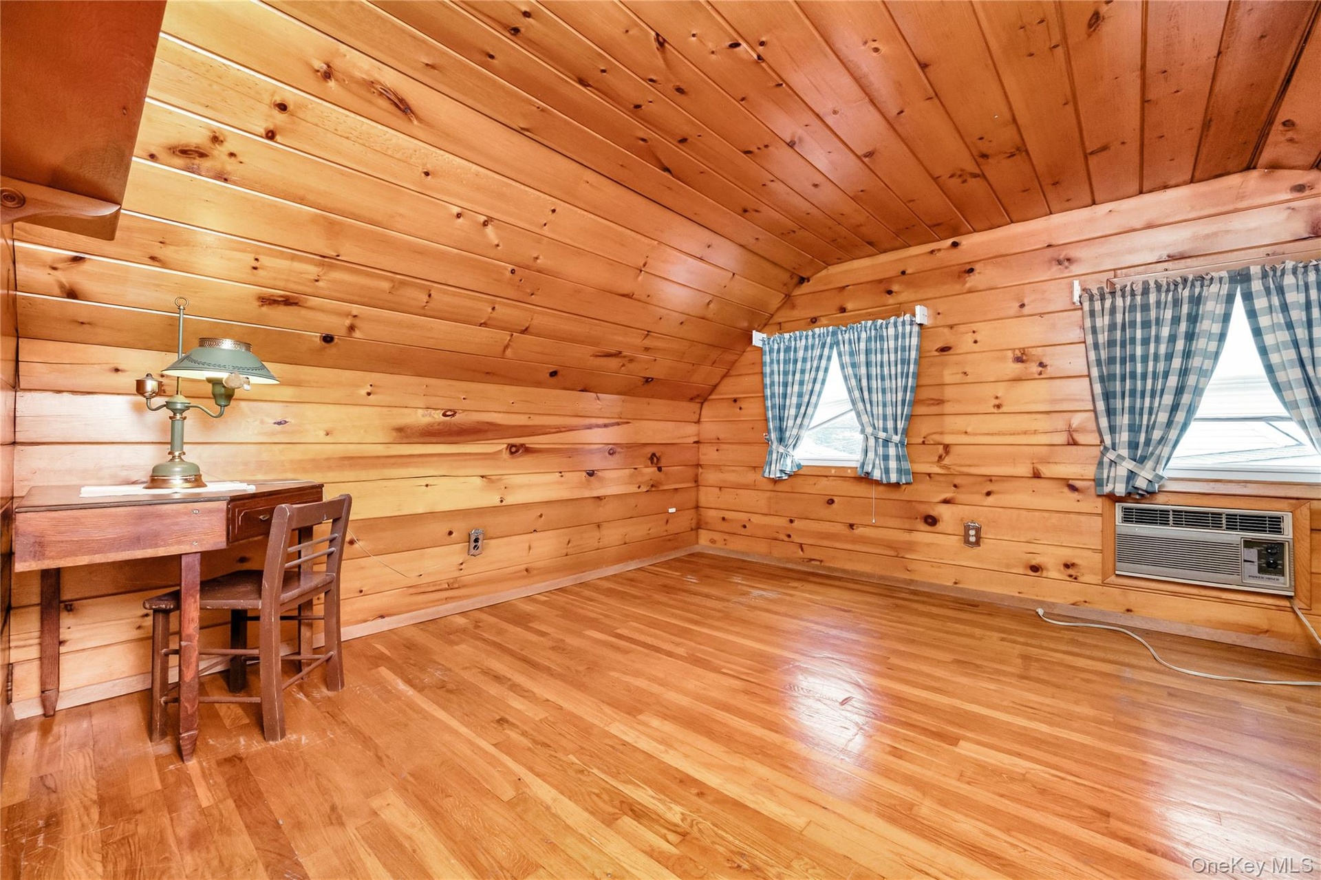 - Bedroom featuring lofted ceiling, hardwood / wood-style Laminate floors, wood walls, and wooden ceiling
