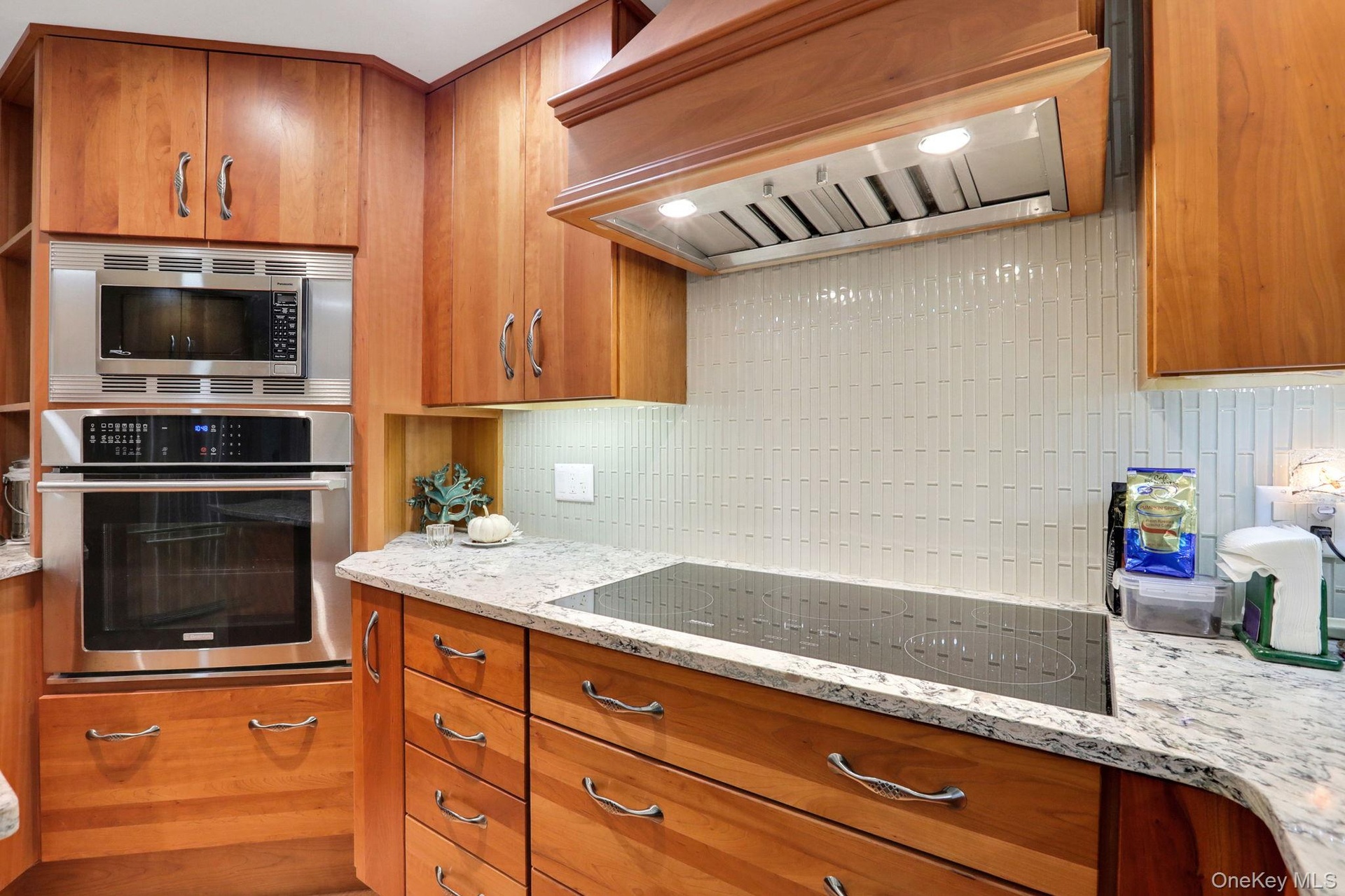 - Kitchen featuring decorative backsplash, extractor fan, stainless steel appliances, light stone countertops, and brown cabinetry