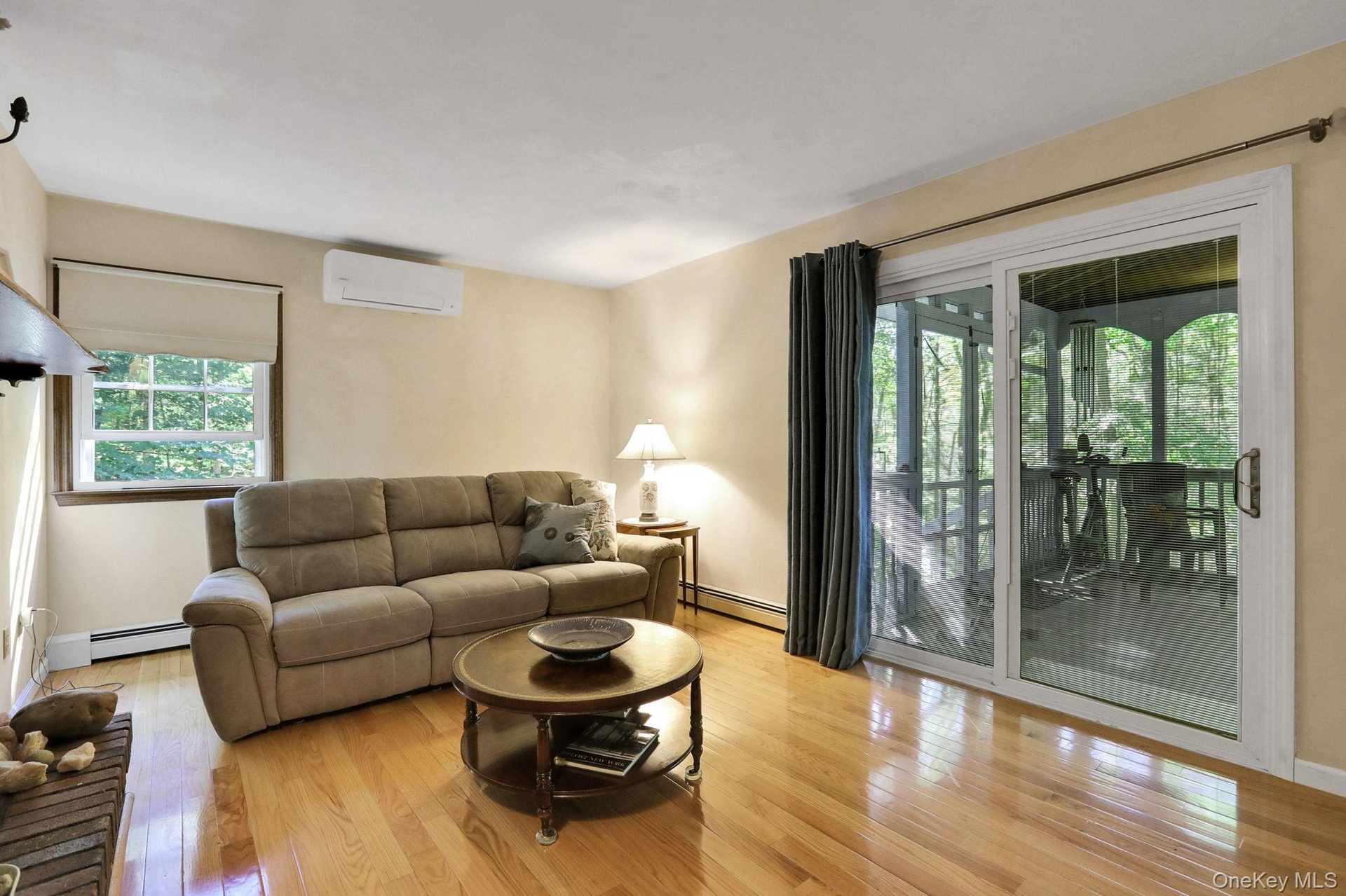- Living area with a baseboard radiator, wood finished floors, and a wall mounted AC