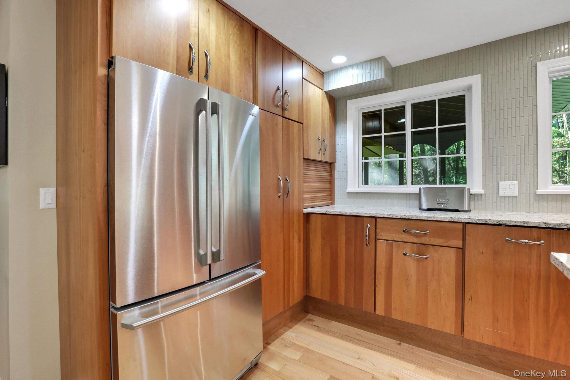- Kitchen featuring freestanding refrigerator, light wood finished floors, brown cabinetry, light stone counters, and recessed lighting