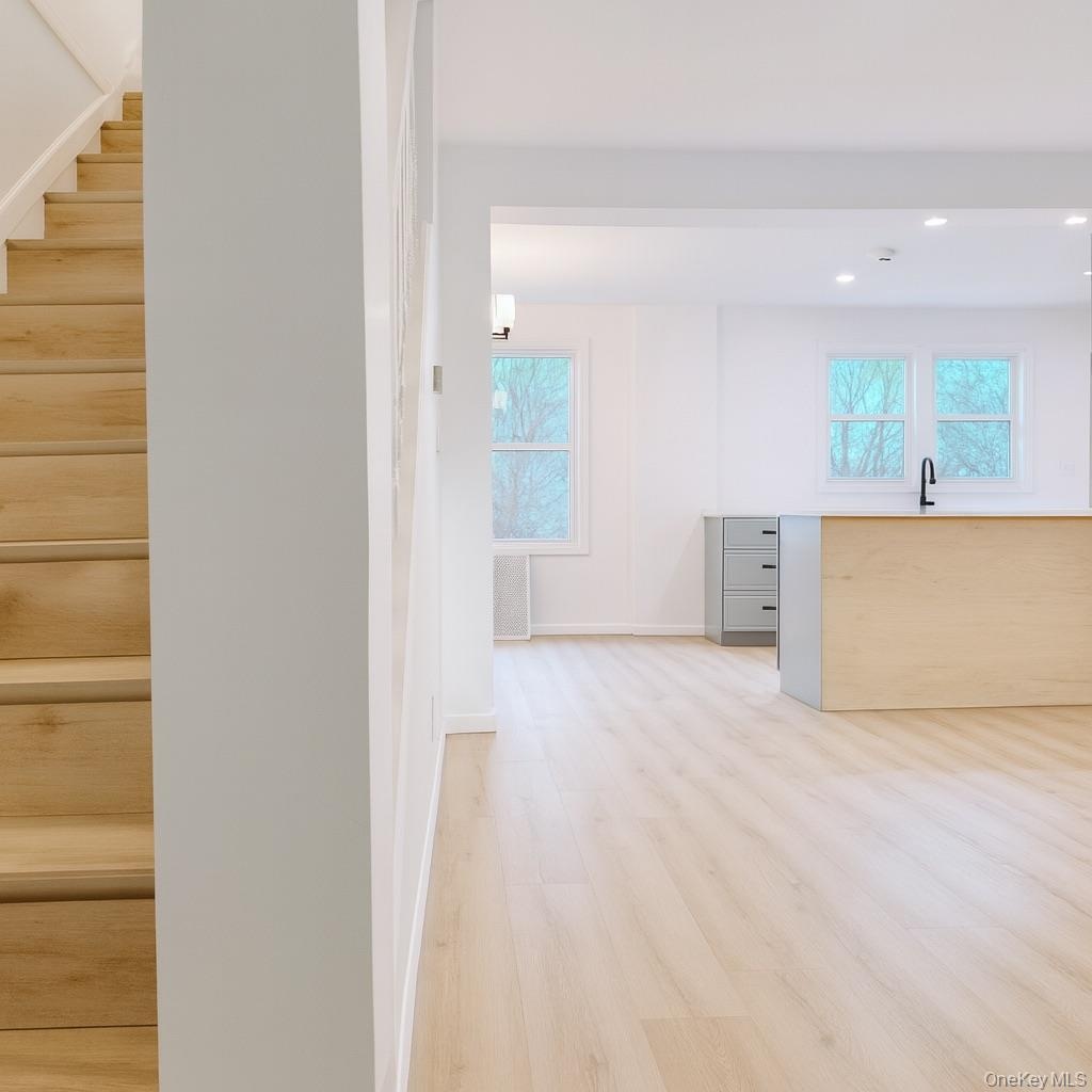 - Unfurnished living room featuring vaulted ceiling, light wood-type flooring, recessed lighting, and a baseboard radiator
