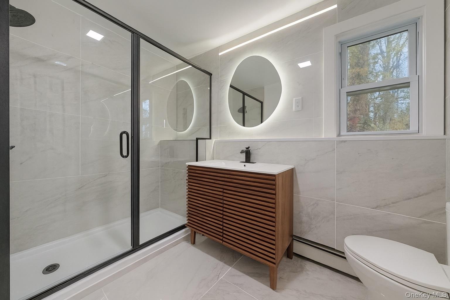 - Main level full bath with vanity, a shower stall, tile walls, baseboard heating, and light marble finish flooring