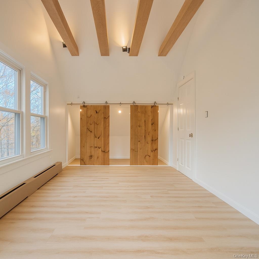 - Top level room with baseboard heating, beamed ceiling, wood finished floors, a barn door, and high vaulted ceiling