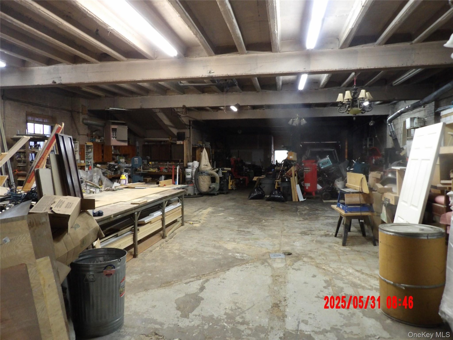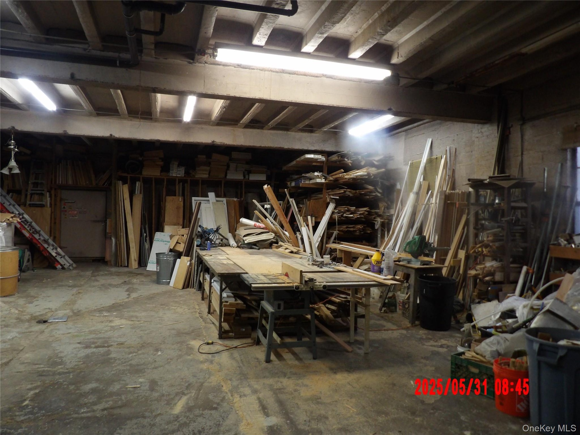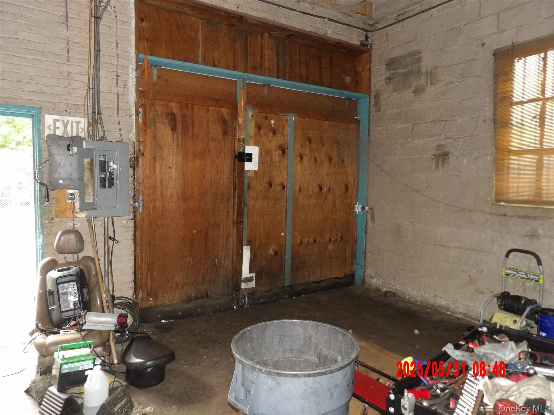 - Garage with concrete block wall and a workshop area