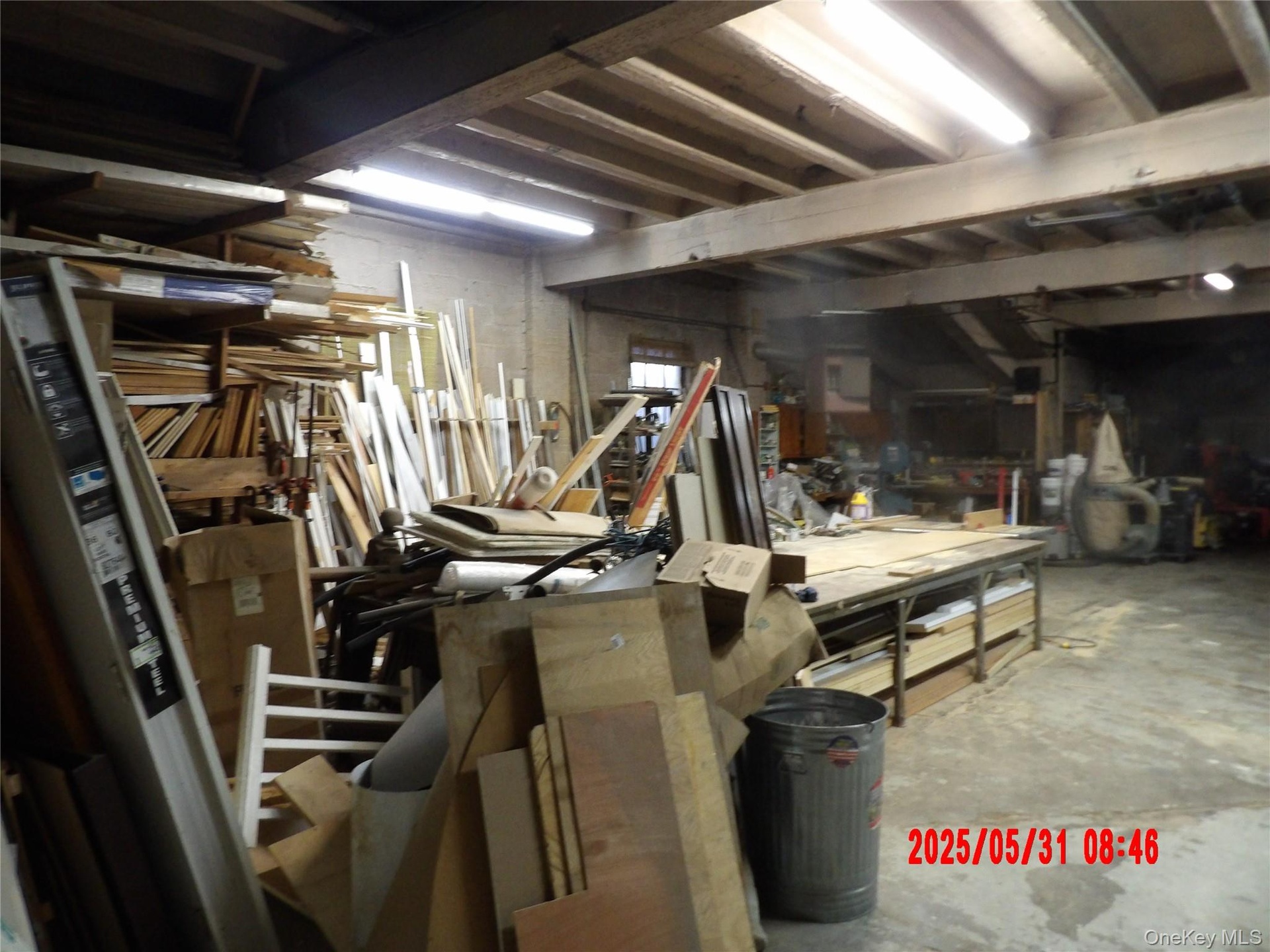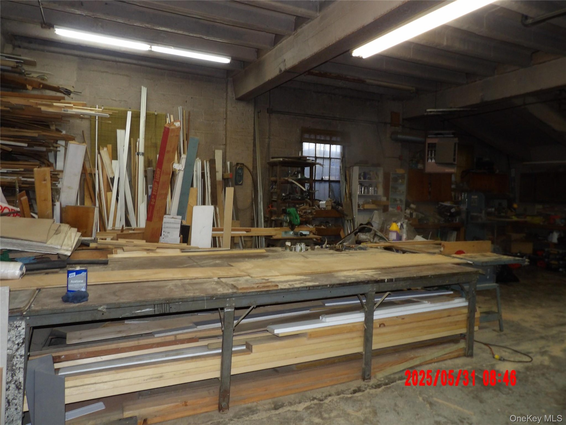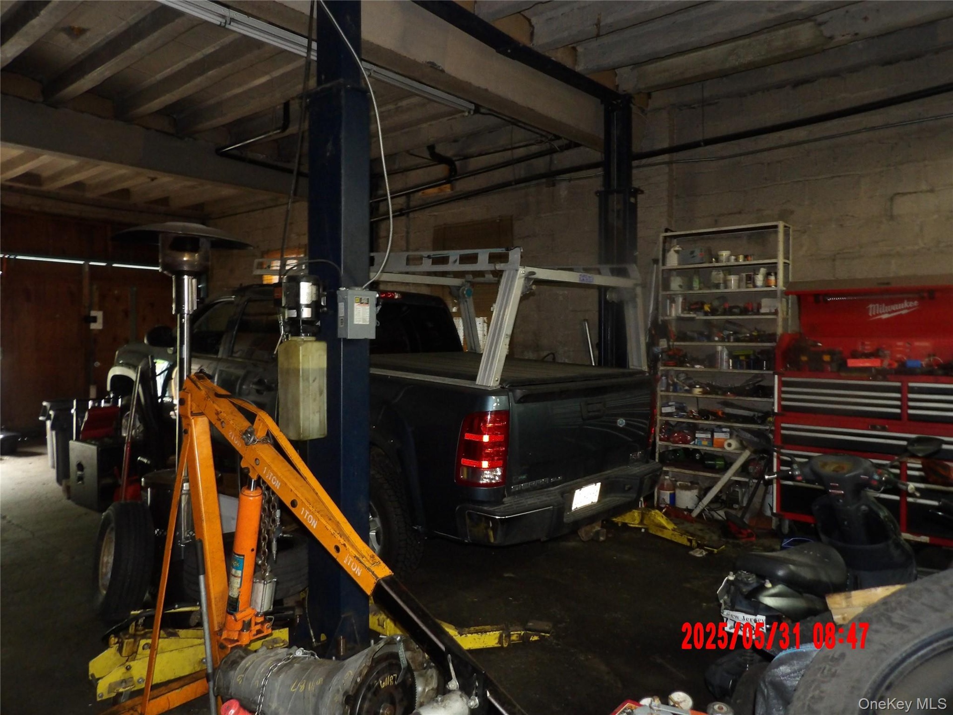 - Garage with concrete block wall and a workshop area