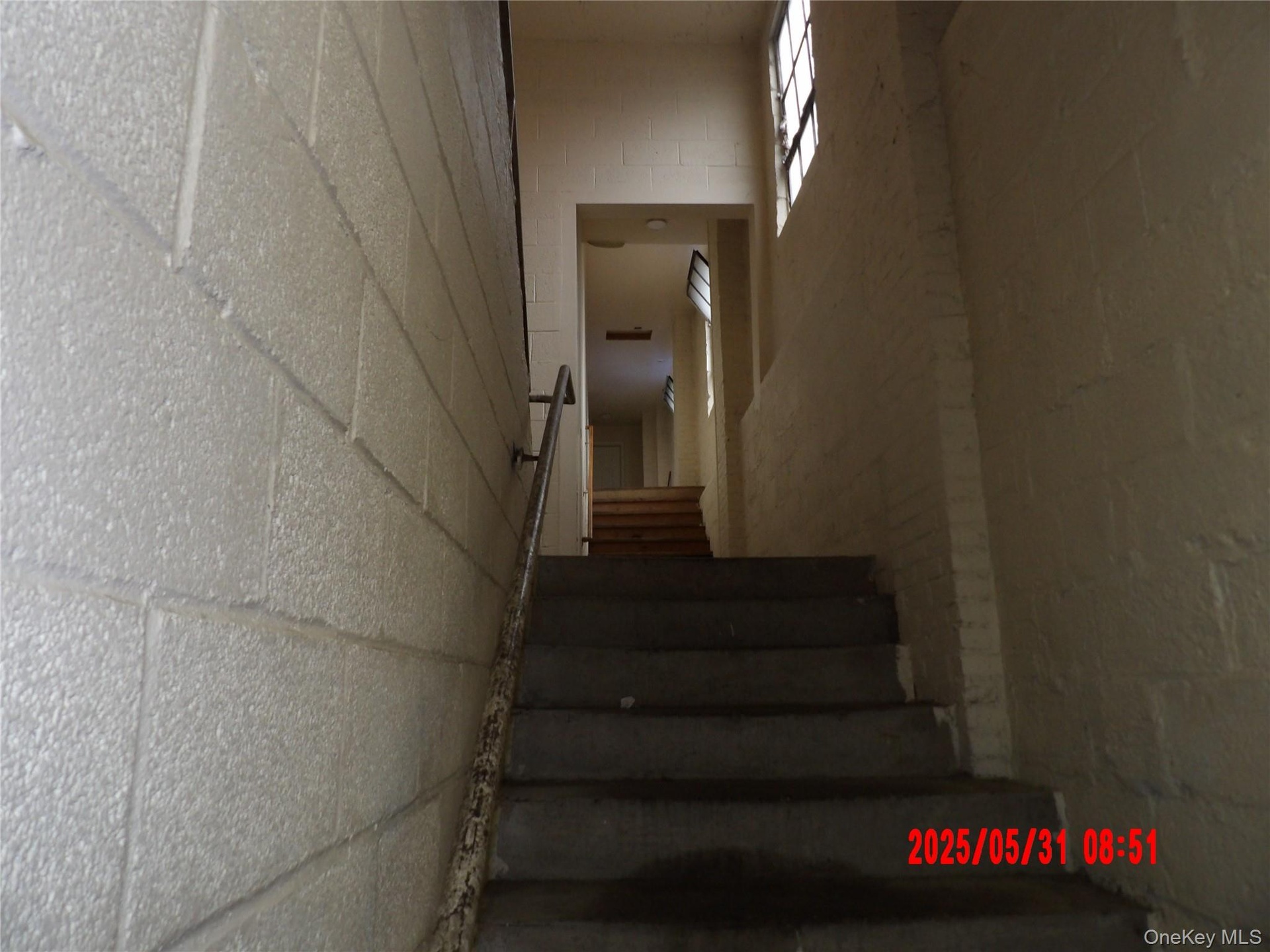 - Stairway featuring concrete block wall