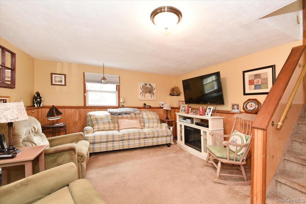 - Living area featuring wainscoting, wood walls, carpet flooring, and stairway