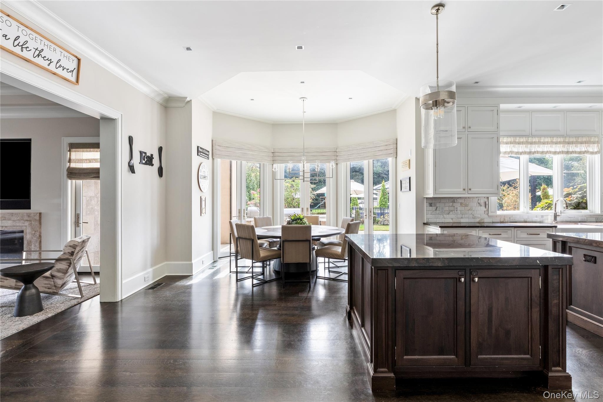 A striking stone and stucco facade with oversized black-trim windows sets a sophisticated tone upon arrival. Inside, a dramatic marble foyer with a sweeping spiral staircase unveils the heart of the home: a voluminous great room featuring soaring ceilings, a sleek gas fireplace, bespoke wet bar, and walls of glass that dissolve the boundary between indoors and out. Every inch of this residence speaks to thoughtful luxury. The chef’s kitchen is clad in two-toned cabinetry, boasts a suite of chef-grade stainless steel appliances and thick-cut stone countertops. The welcoming family room has a warm fireplace with a custom, stone mantel and beautiful natural wood built-ins. Entertain effortlessly in the formal dining room, designed to host 14+ guests, supported by a fully outfitted butler’s pantry.