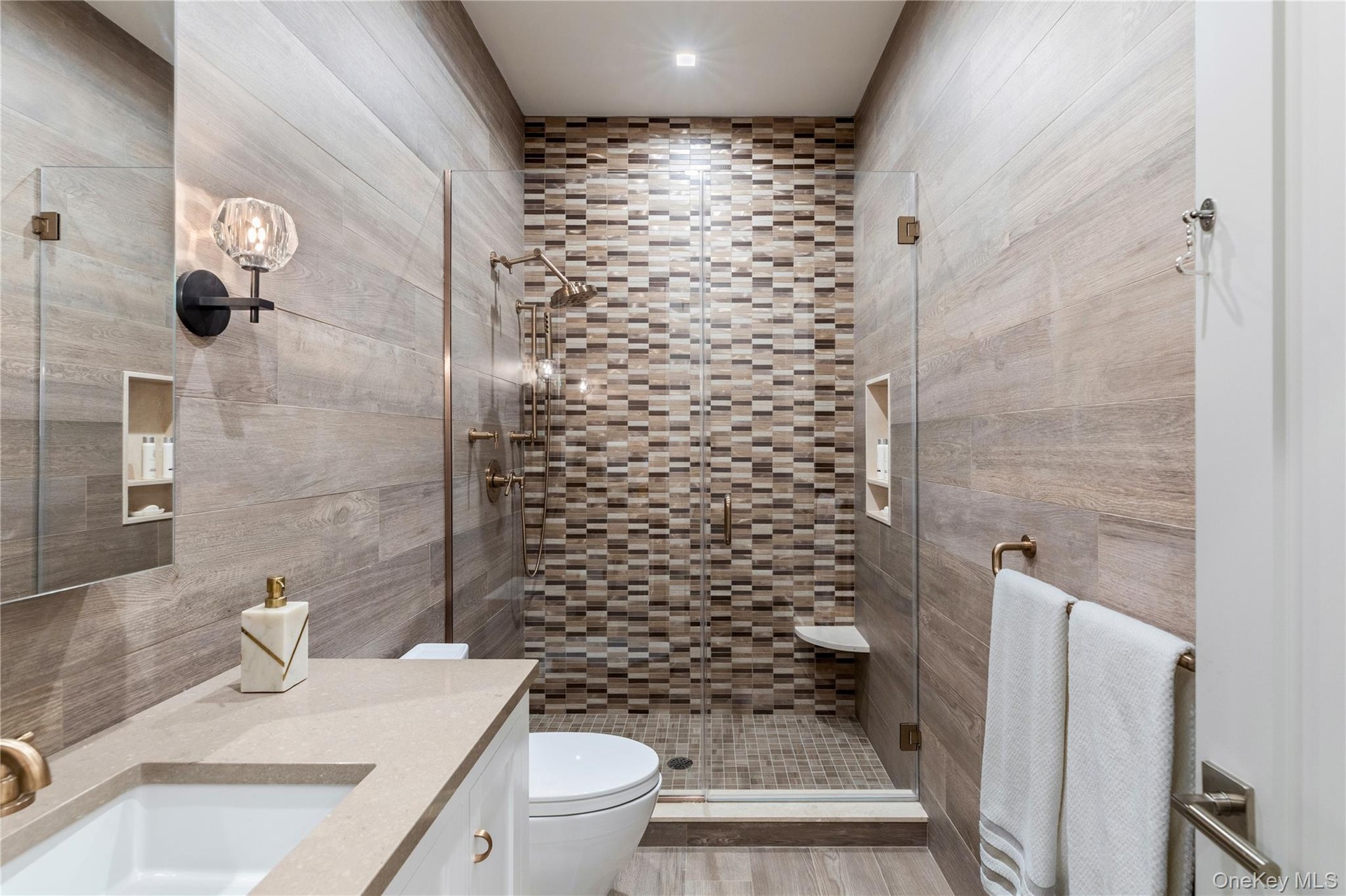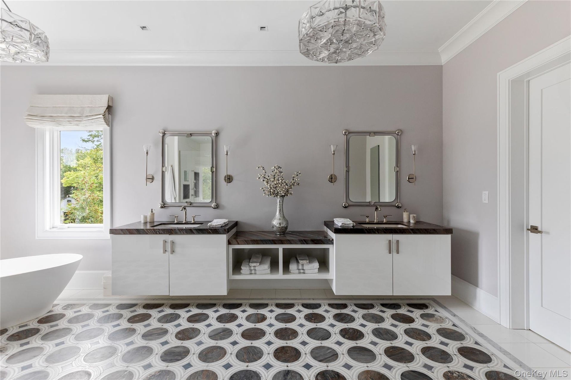 Upstairs, the primary wing evokes the atmosphere of a five-star hotel, complete with a private lounge, dressing and vanity area, spa-like bath with an oversized rain shower and soaking tub, radiant heated floors, and multiple walk-in closets, with custom wardrobe installations. There are four additional bedrooms, four marble full-bathrooms and an expansive laundry room.