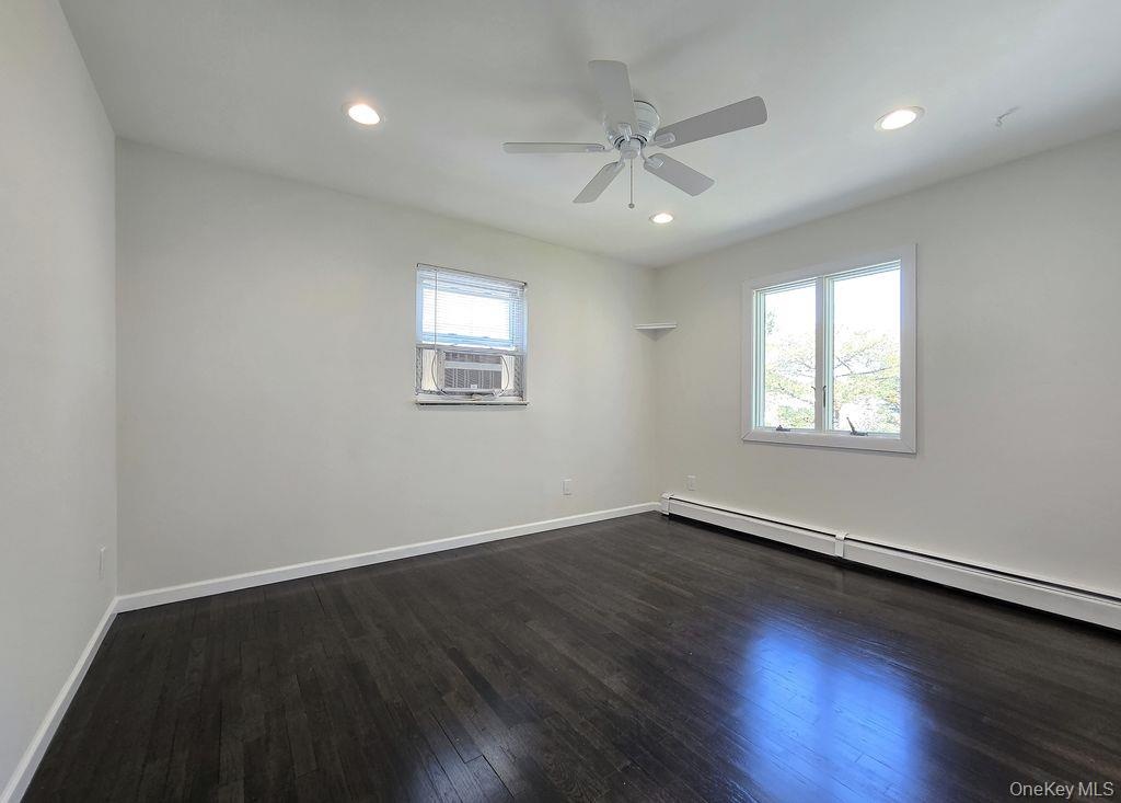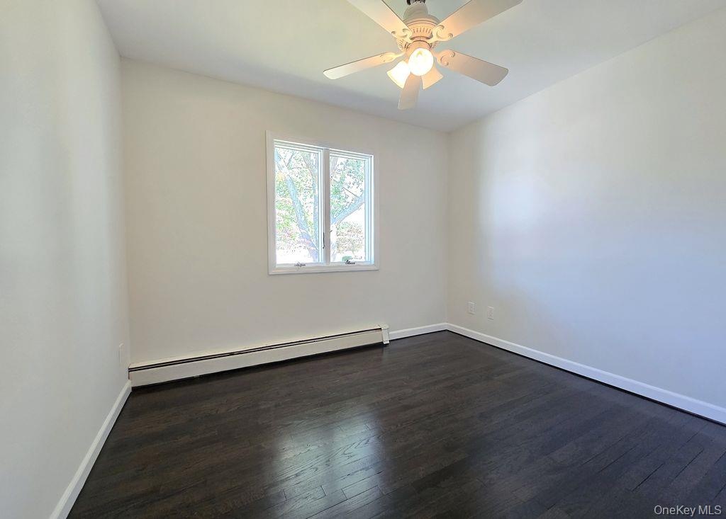 - Empty room with dark wood-style flooring, a baseboard heating unit, and ceiling fan
