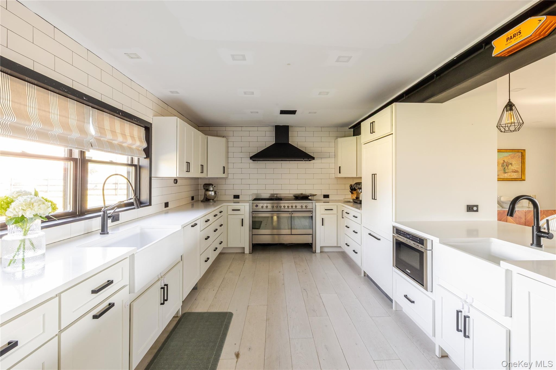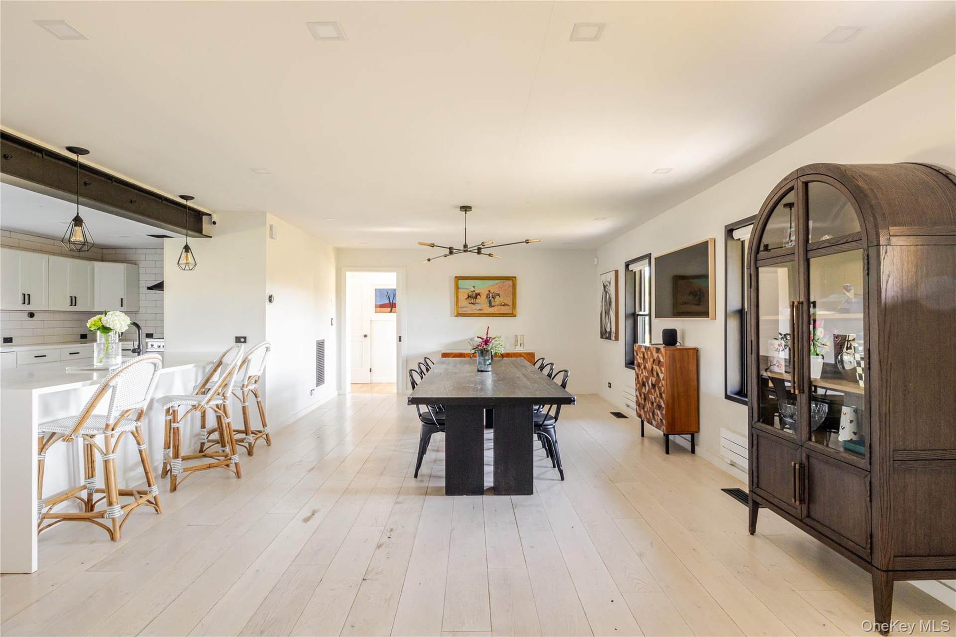 The 3,000-square-foot farmhouse has open, light-filled spaces and refined details. Wide plank wood floors flow throughout, and vaulted ceilings in the bedrooms create bright, airy retreats. The chef’s kitchen features quartz countertops, a commercial-grade range, double dishwashers, and abundant cabinetry. A large dining room sits just off the kitchen, ideal for family meals or holiday gatherings. The family room provides casual space for relaxing, while a private in-law suite with its own entrance offers flexibility for guests or extended stays. Upstairs, the primary suite includes a newly renovated bathroom and hilltop views, and two additional bedrooms each have ensuite baths and convenient laundry access.