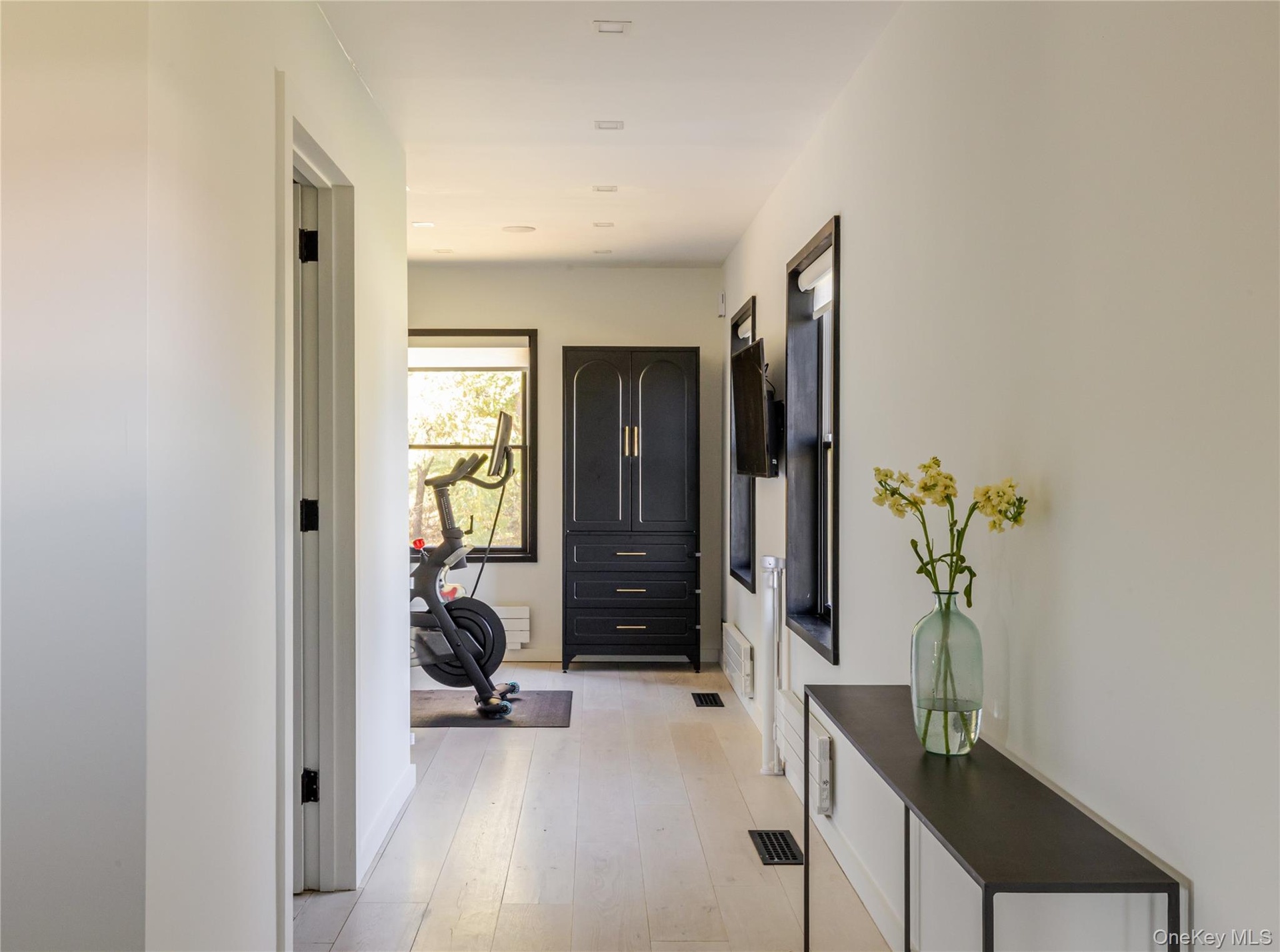 - Workout room featuring radiator heating unit and light wood-type flooring