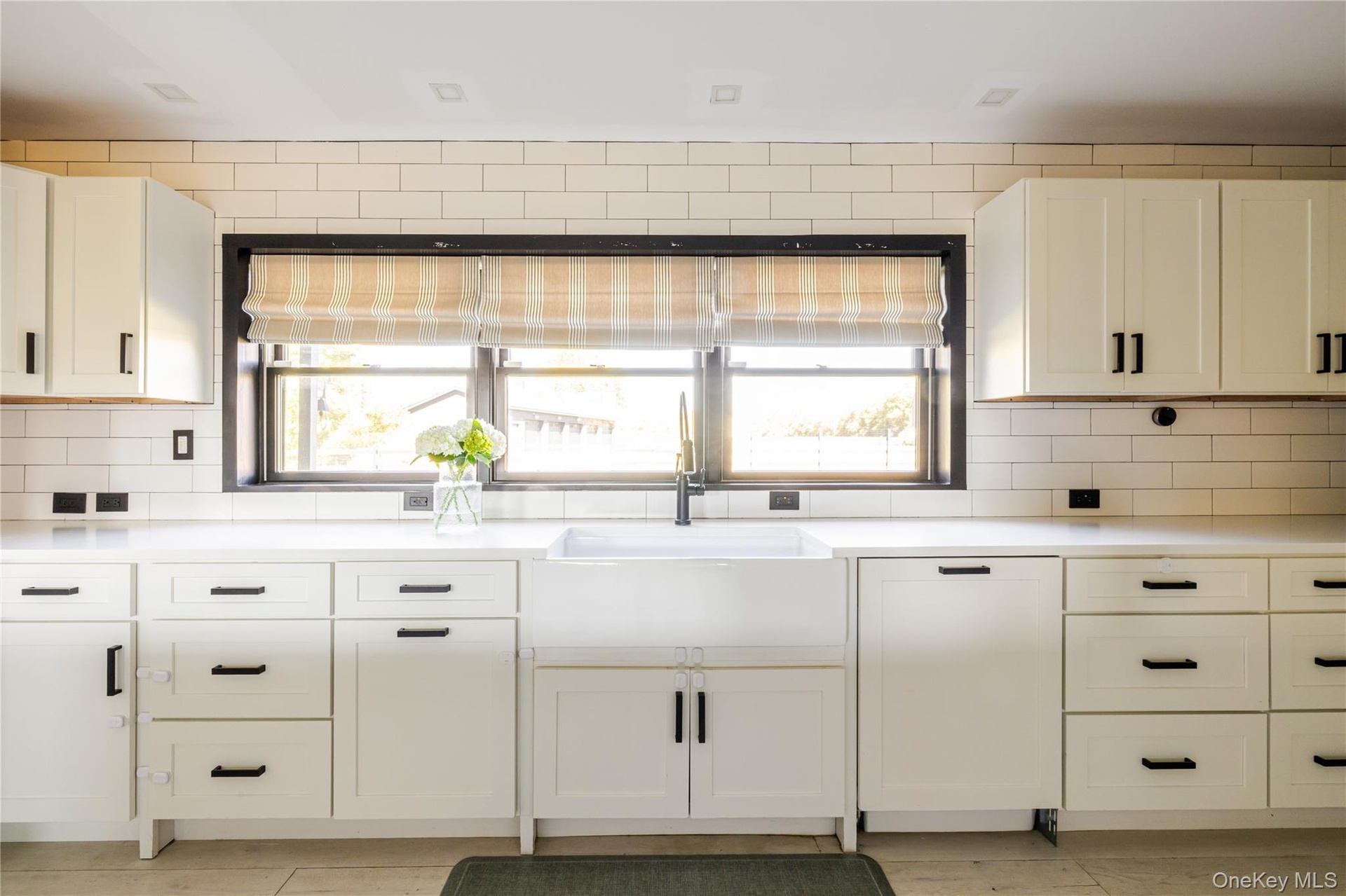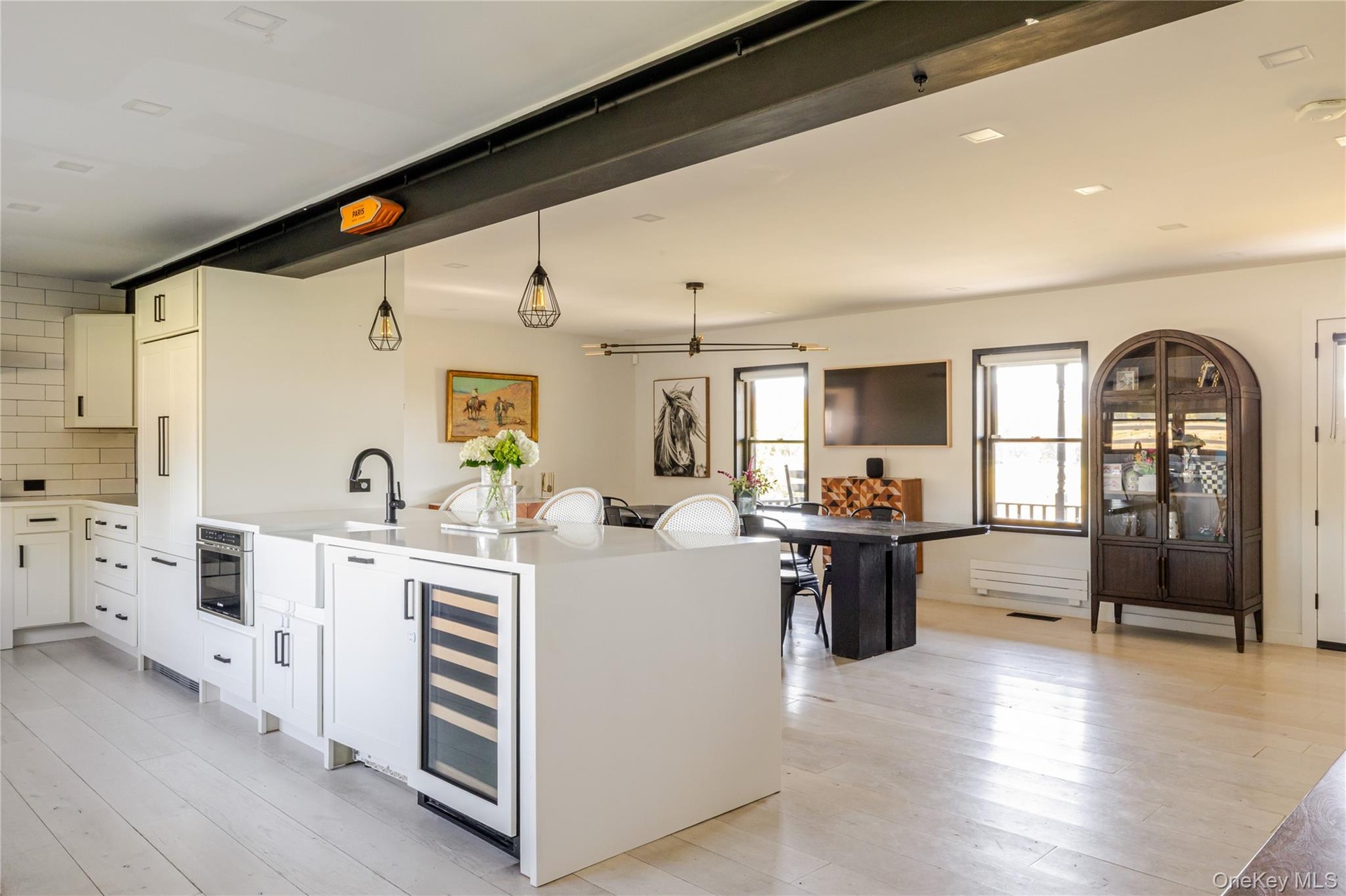 - Kitchen with tasteful backsplash, hanging light fixtures, a peninsula, white cabinets, and beverage cooler