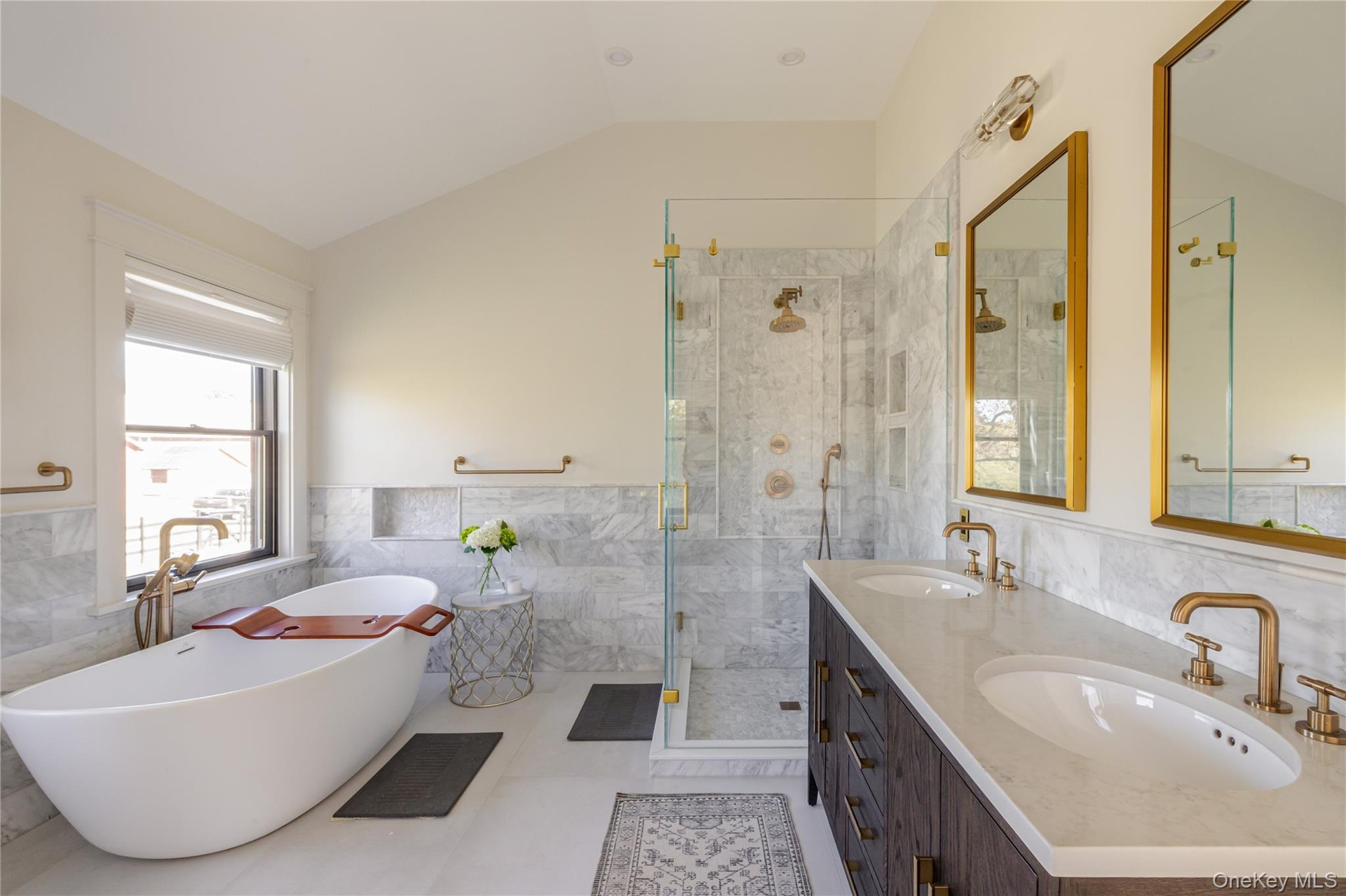 - Bathroom with tile walls, a stall shower, a freestanding tub, double vanity, and a wainscoted wall