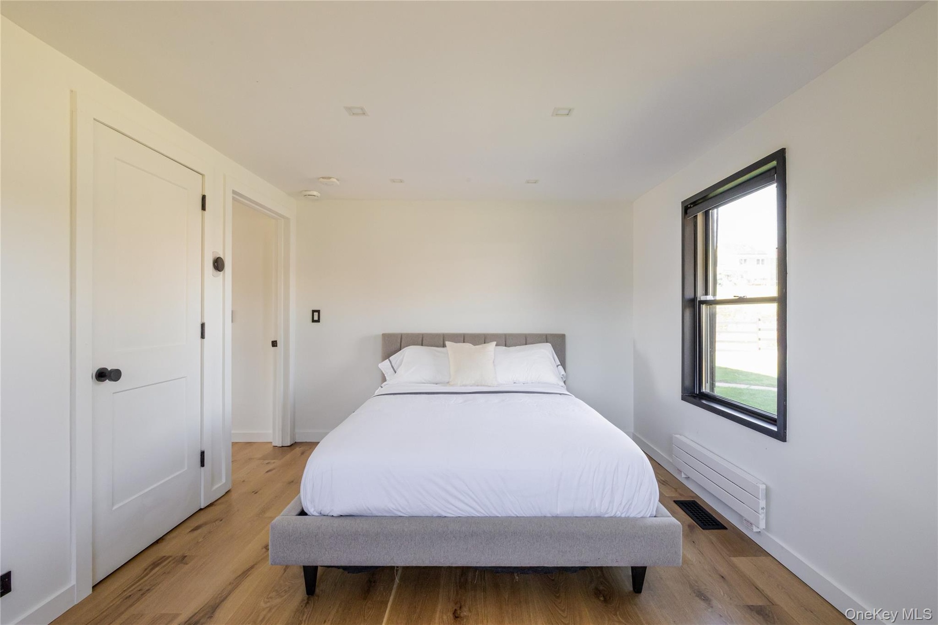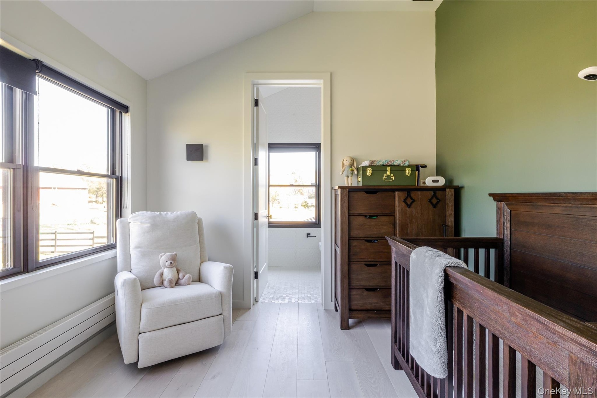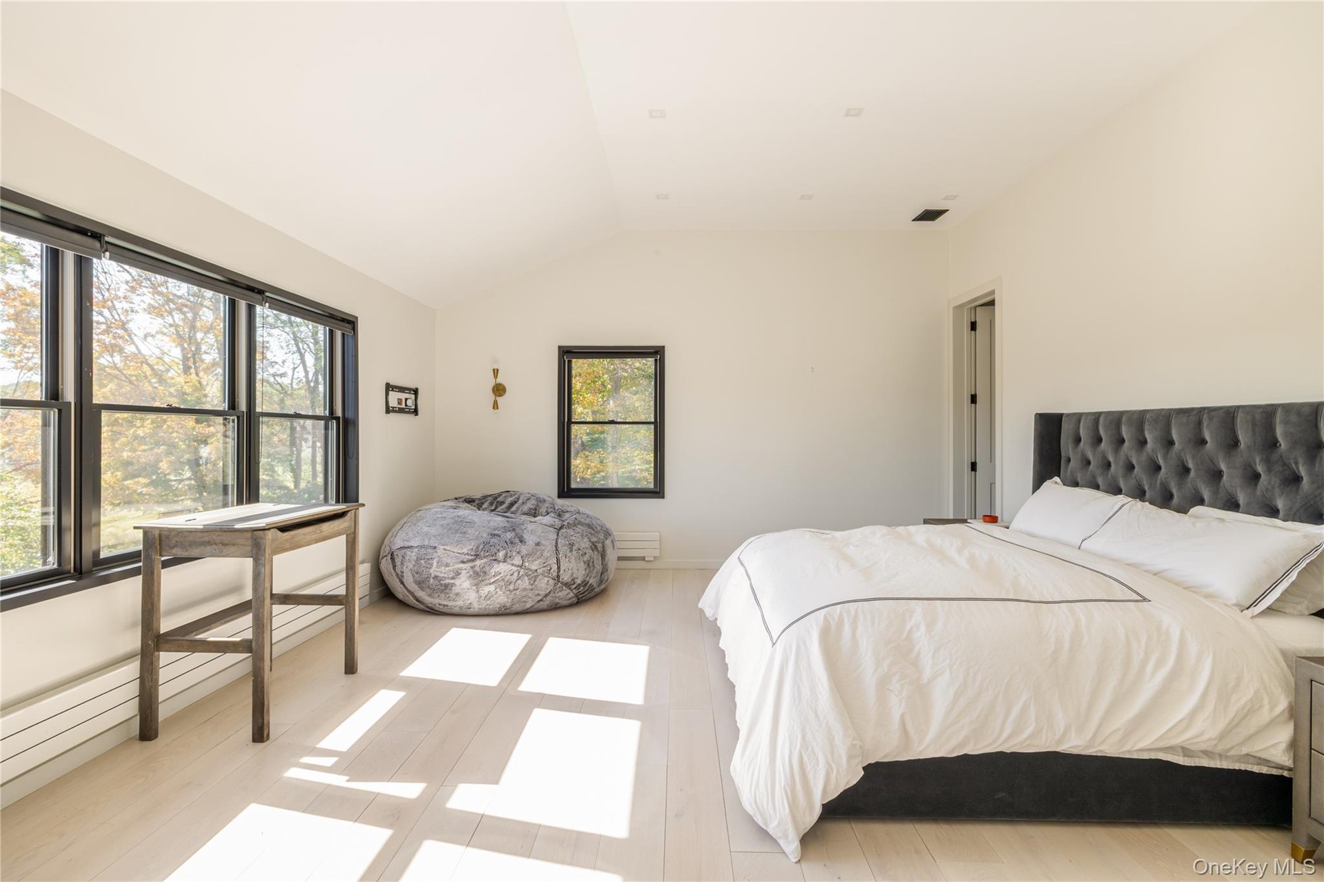 - Bedroom with vaulted ceiling, light wood-type flooring, and baseboard heating
