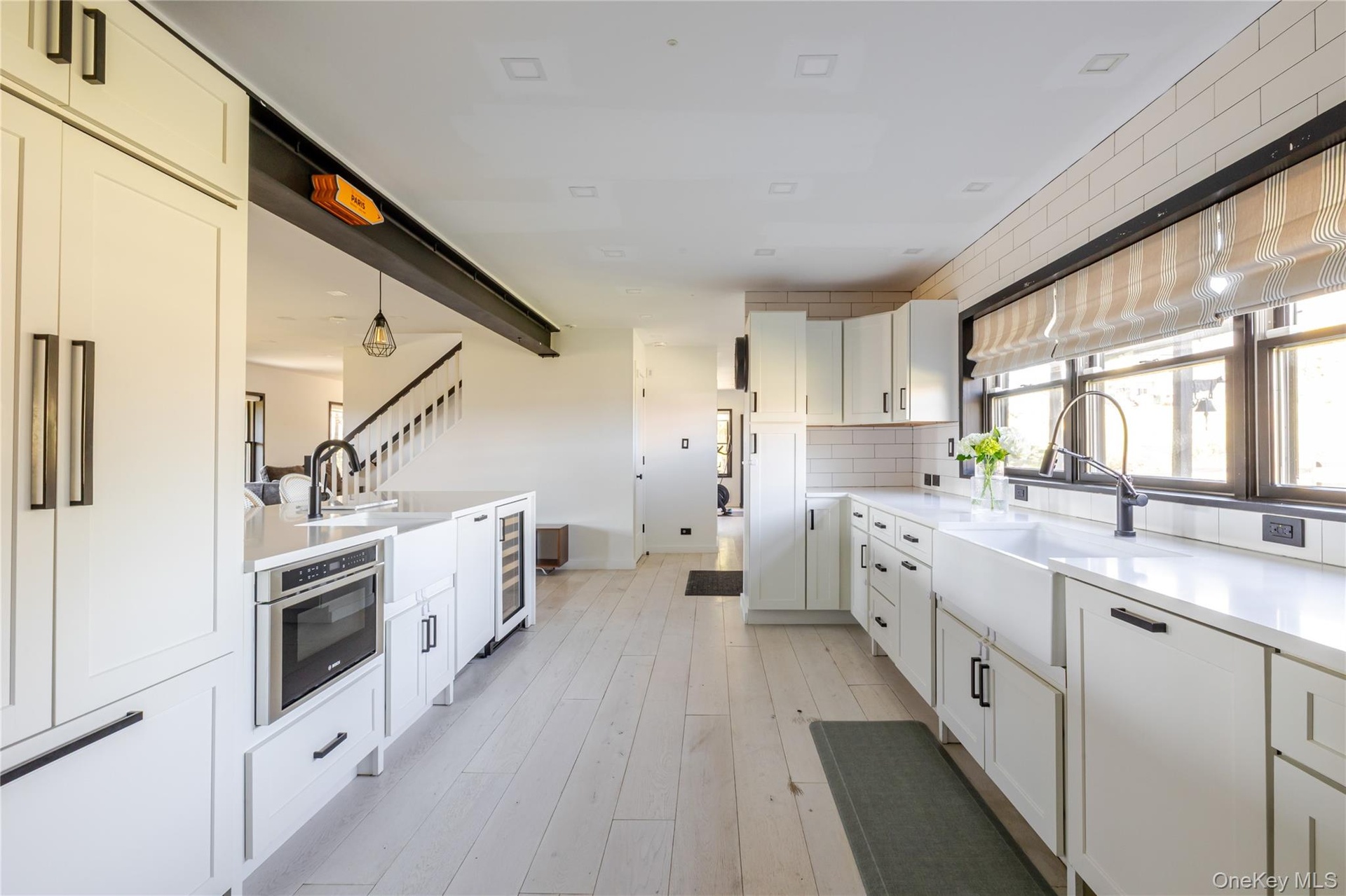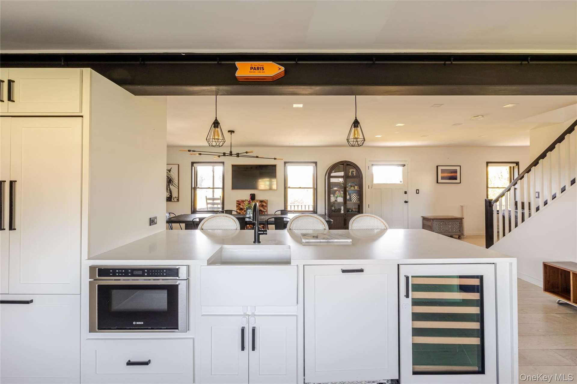 - Kitchen featuring a peninsula, beverage cooler, white cabinets, decorative light fixtures, and stainless steel oven