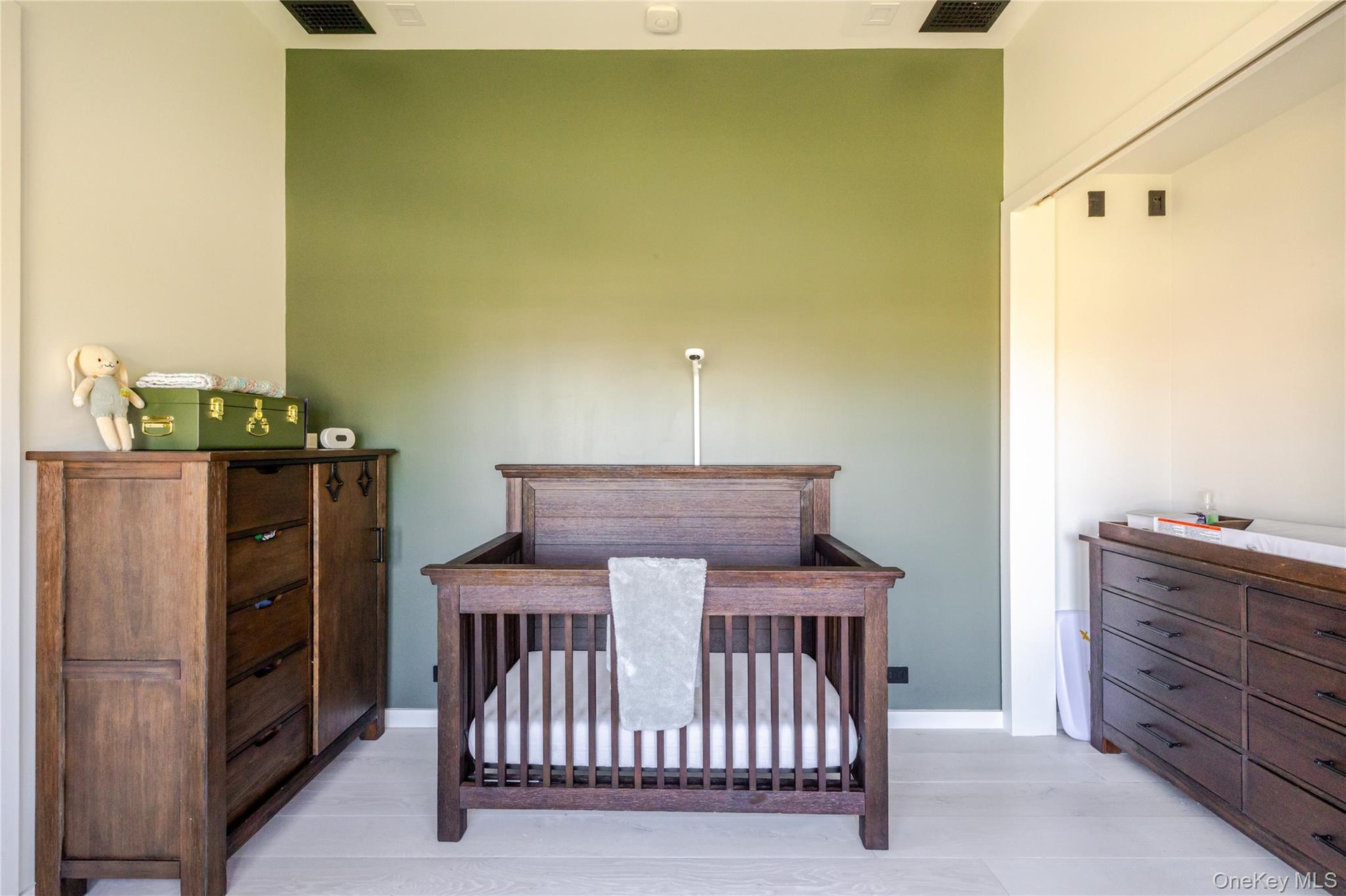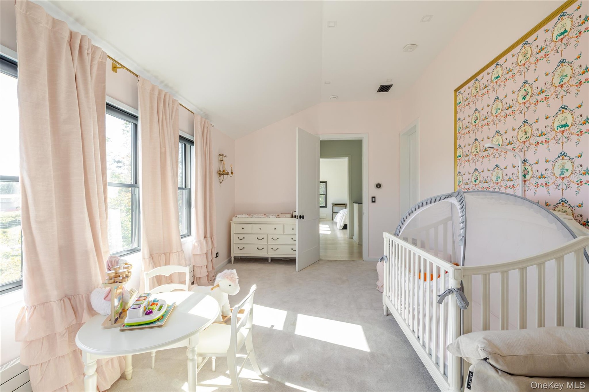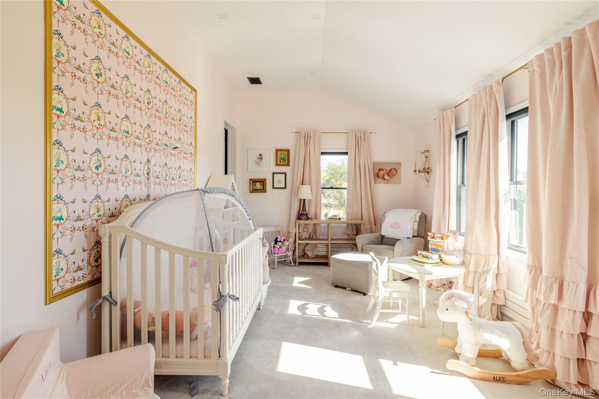 - Carpeted bedroom with lofted ceiling and a nursery area